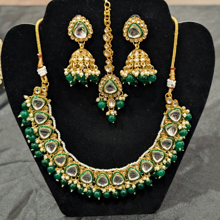 Beautiful Kundan jewellery set with green beads and white accents. Includes a necklace, earrings, and maang tikka. Perfect for weddings or special occasions!