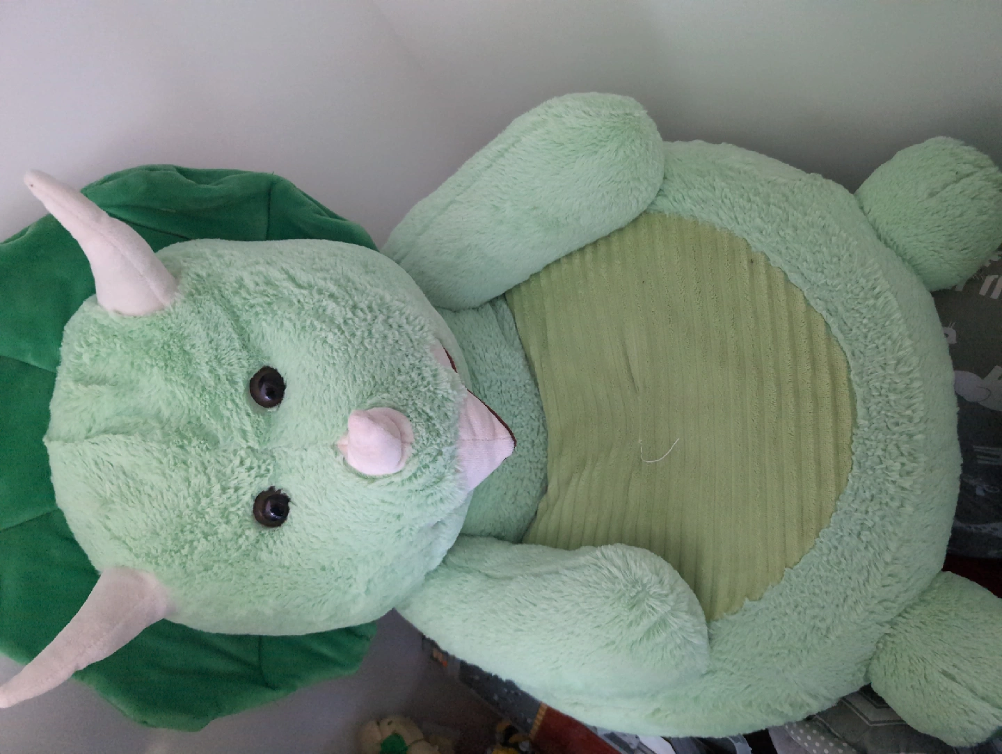 A cute and cuddly green triceratops plush toy! Perfect for kids or anyone who loves dinosaurs. It's in great condition and ready for a new home
