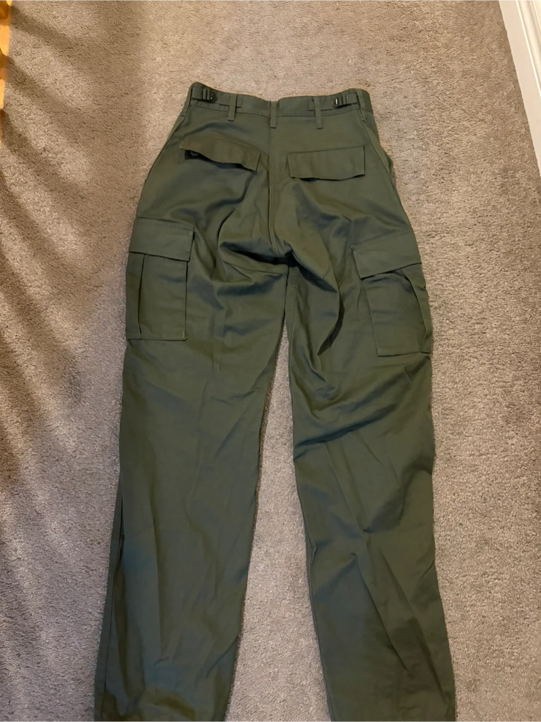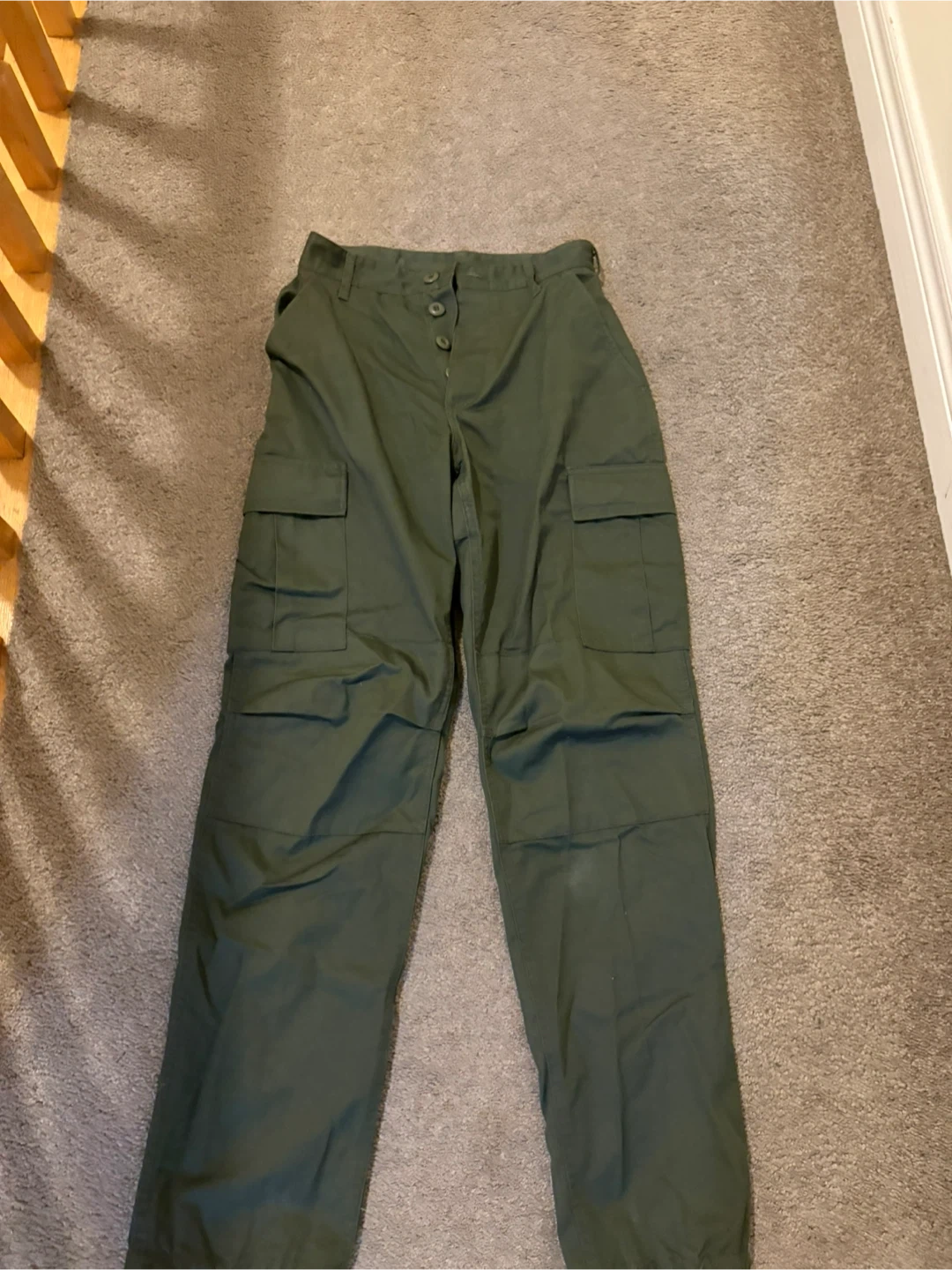 Selling a pair of green cargo pants. They're in great shape and ready for a new home. Perfect for everyday wear or outdoor adventures! Waist 23-27 inches. Inseam 29 1/2 - 32 1/2 inches.