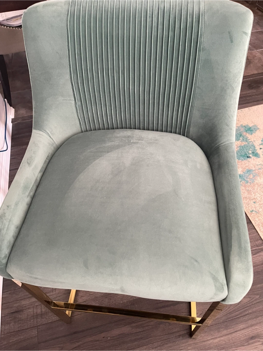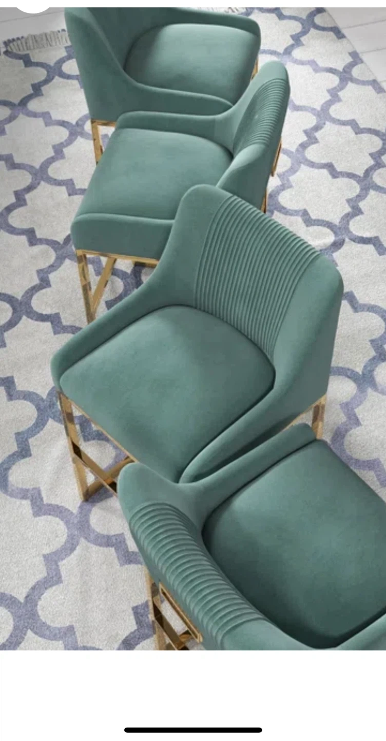 Selling a stylish green velvet bar stool featuring a unique pleated back design and sleek gold legs. It would be a great addition to your kitchen or bar area! 4 bar stool