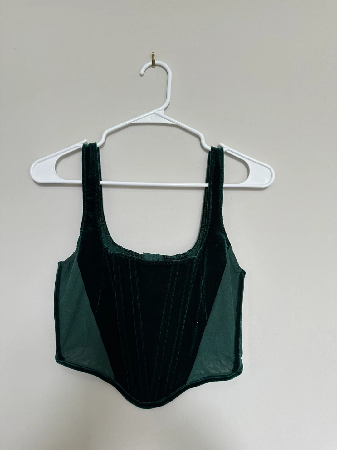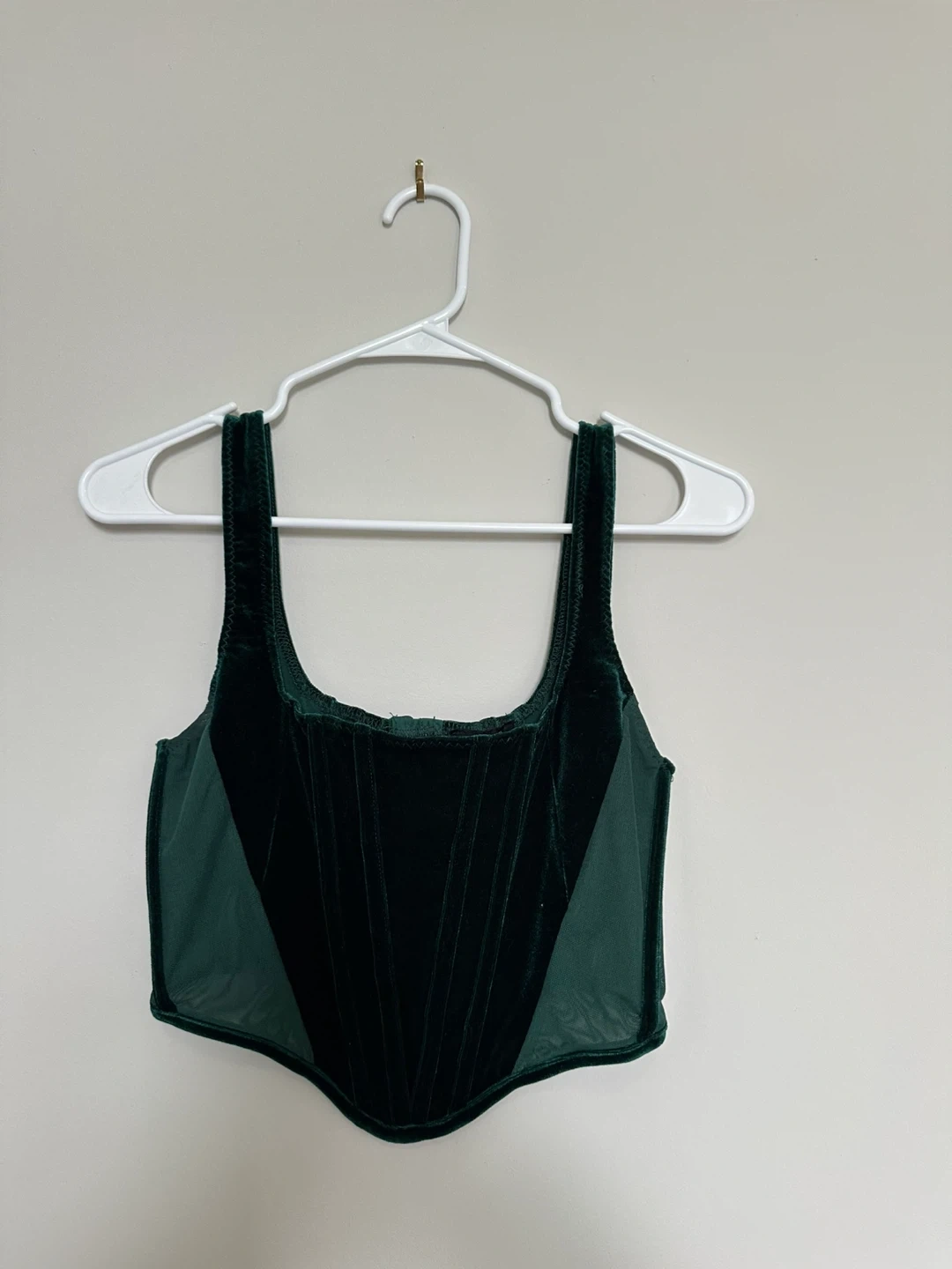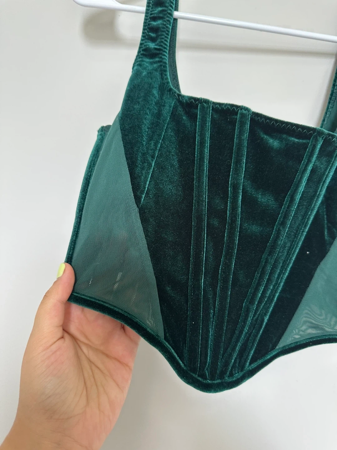 Selling a cute green velvet corset top! It has a unique design with velvet and mesh panels. Perfect for a night out or a special occasion