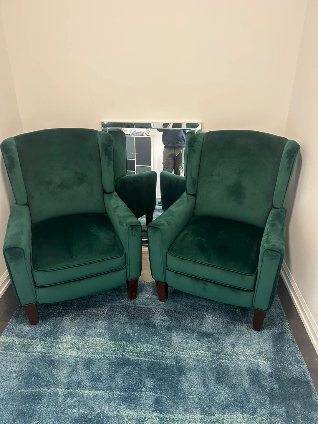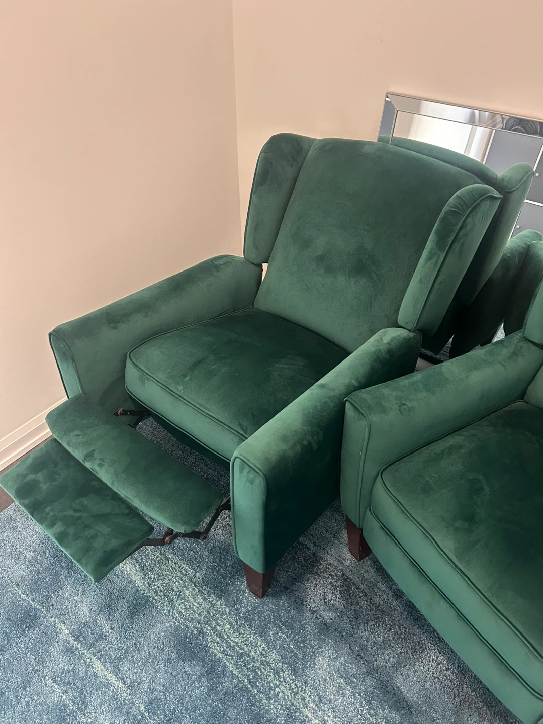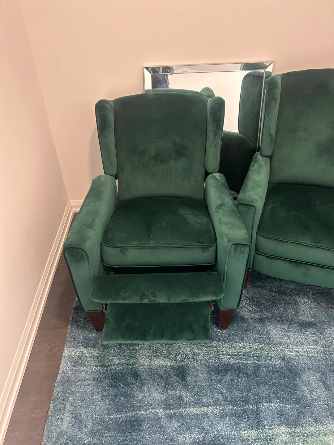 Selling a set of two beautiful green velvet wingback recliner chairs! They would be perfect for a living room or den. The chairs are in great condition and super comfy. They feature a classic wingback design …mirror include with crack in edging but can be fixed easily, a nice piece