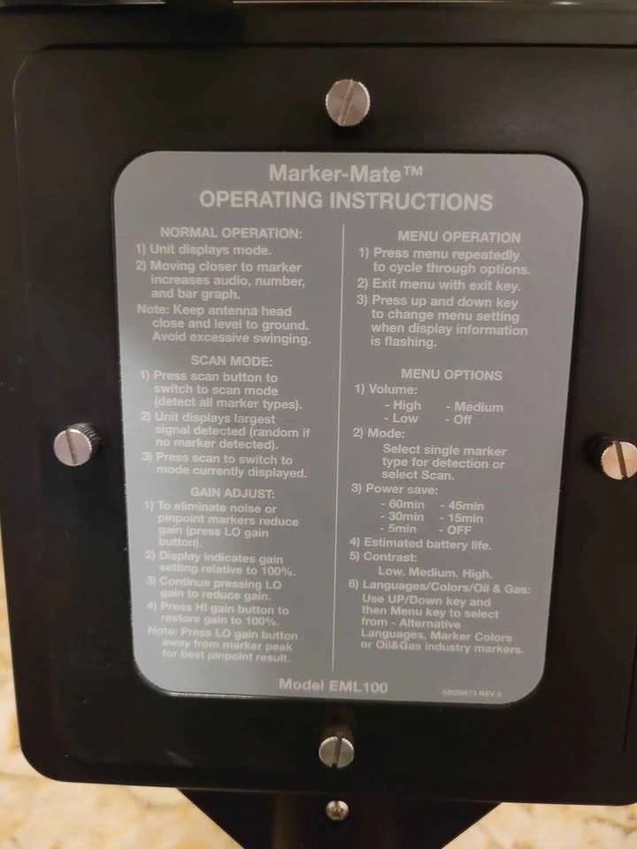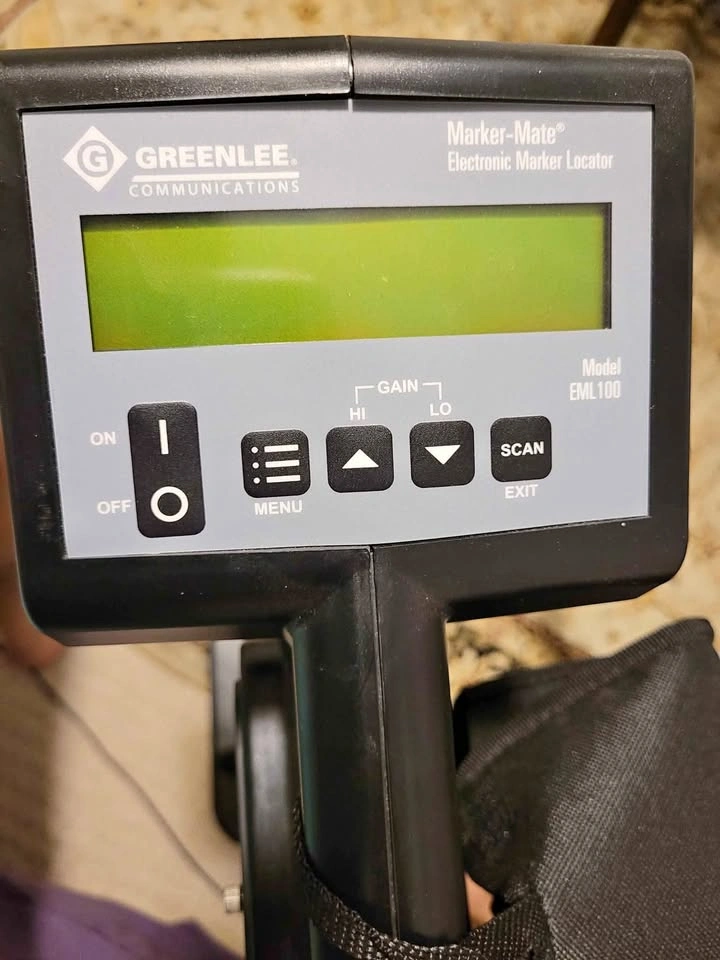 The Greenlee Marker Mate EML100 (also known as the Tempo EML-100) is an electronic marker locator specifically designed for detecting and pinpointing buried electronic utility marker balls. It is widely used to locate buried utility markers for power, water, sanitary, telephone, gas, cable TV, fiber optic, non-potable water, and power lines.