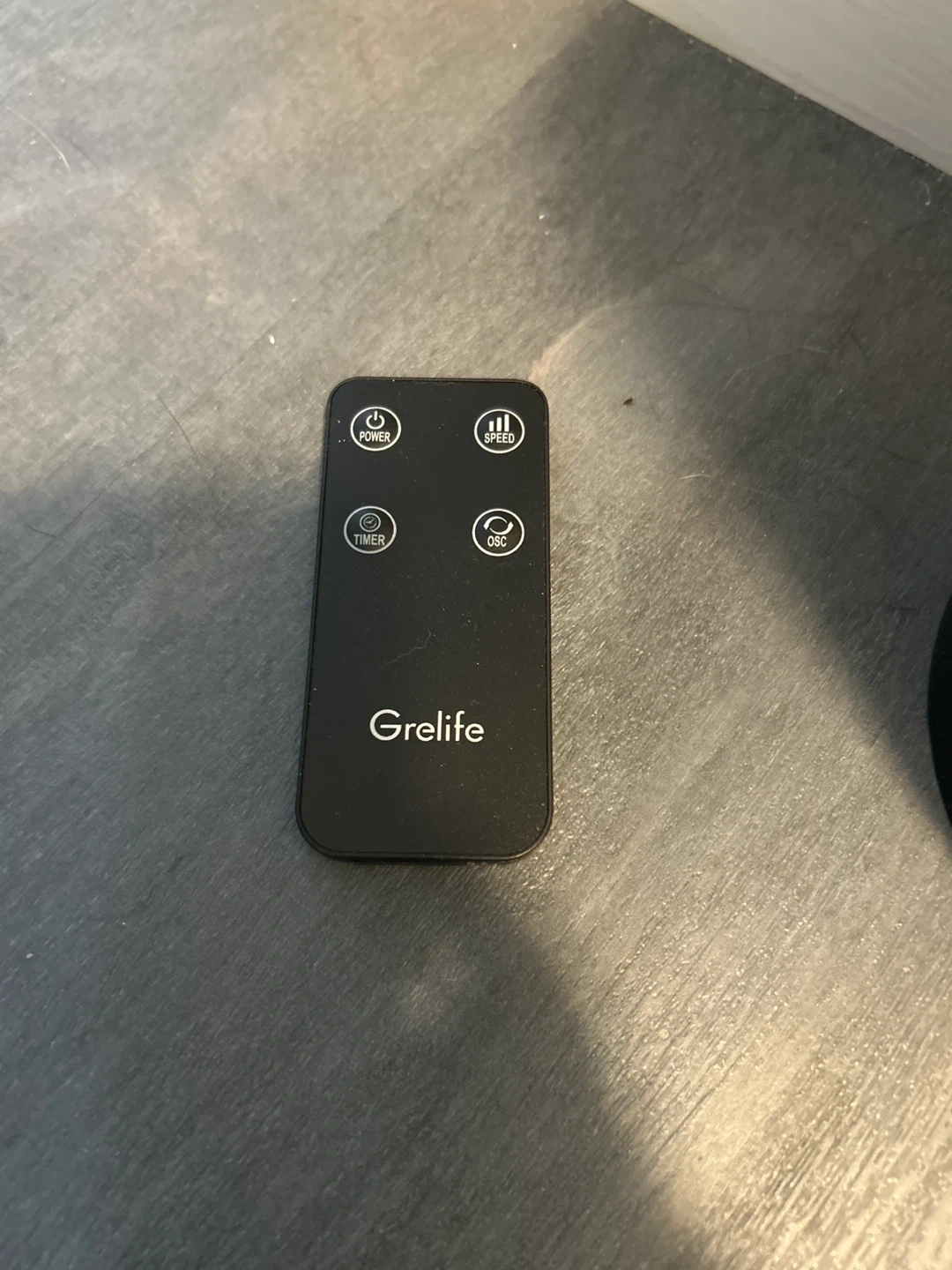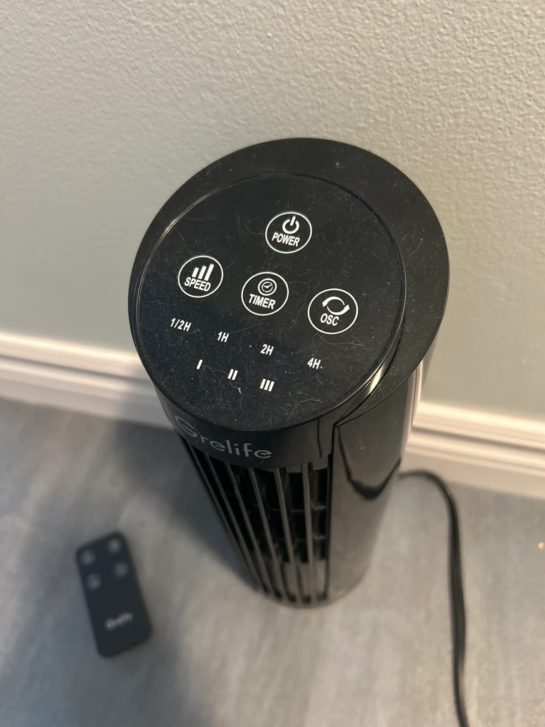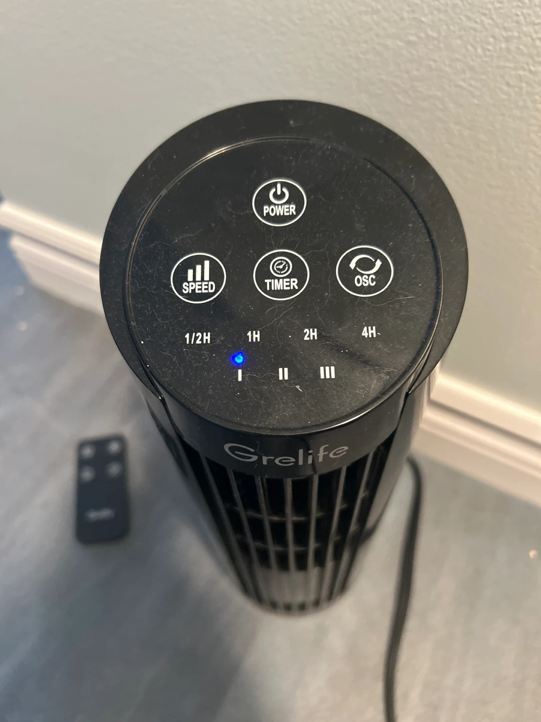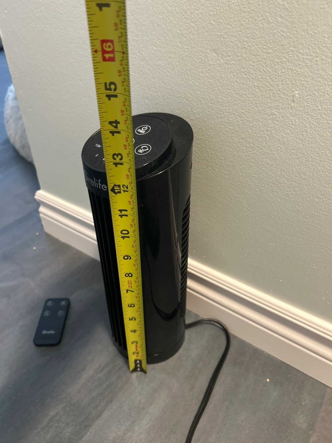 Selling a Grelife tower fan in black. It comes with a remote control for easy operation. The fan measures approximately 13 inches in height. Great for keeping cool during the summer months!