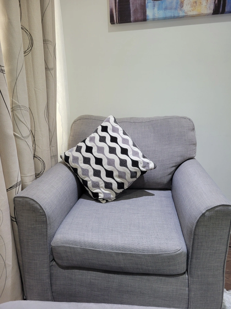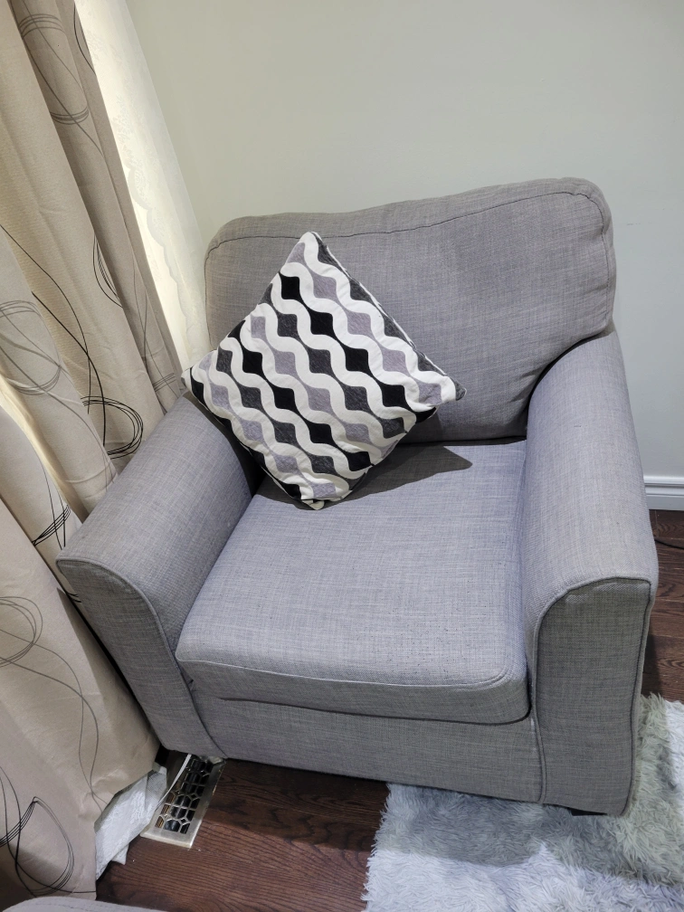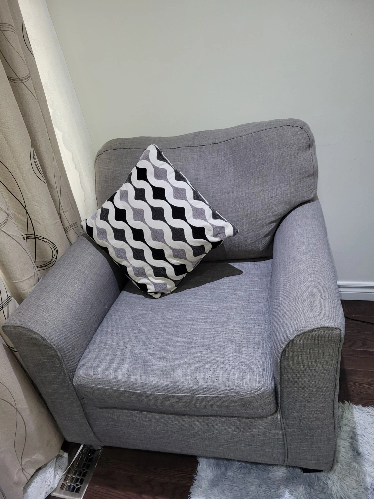Selling a comfy grey armchair! It's in good shape and would be a perfect addition to any living room or bedroom. The fabric is a nice neutral grey, so it will match almost any decor. Perfect for curling up with a good book or watching a movie!