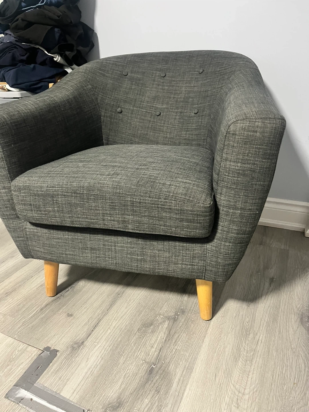 Selling a comfy grey armchair! It's in great shape and would look great in any living room or bedroom. The fabric is a nice textured grey, and it has cute button detailing on the back. The legs are a light wood colour. It's a great size for curling up with a book