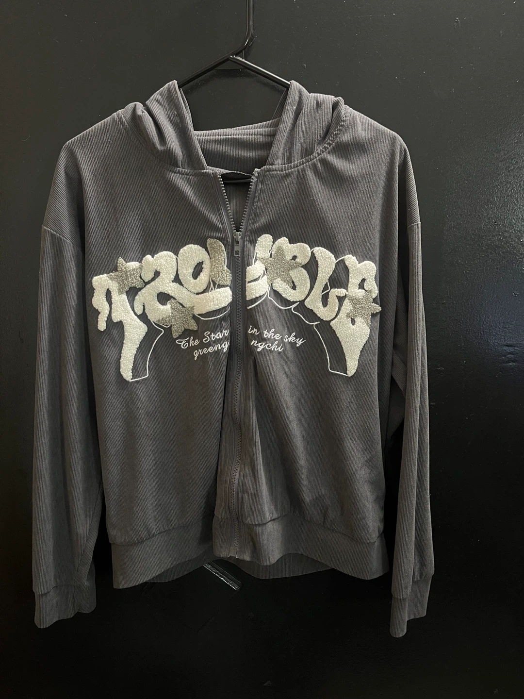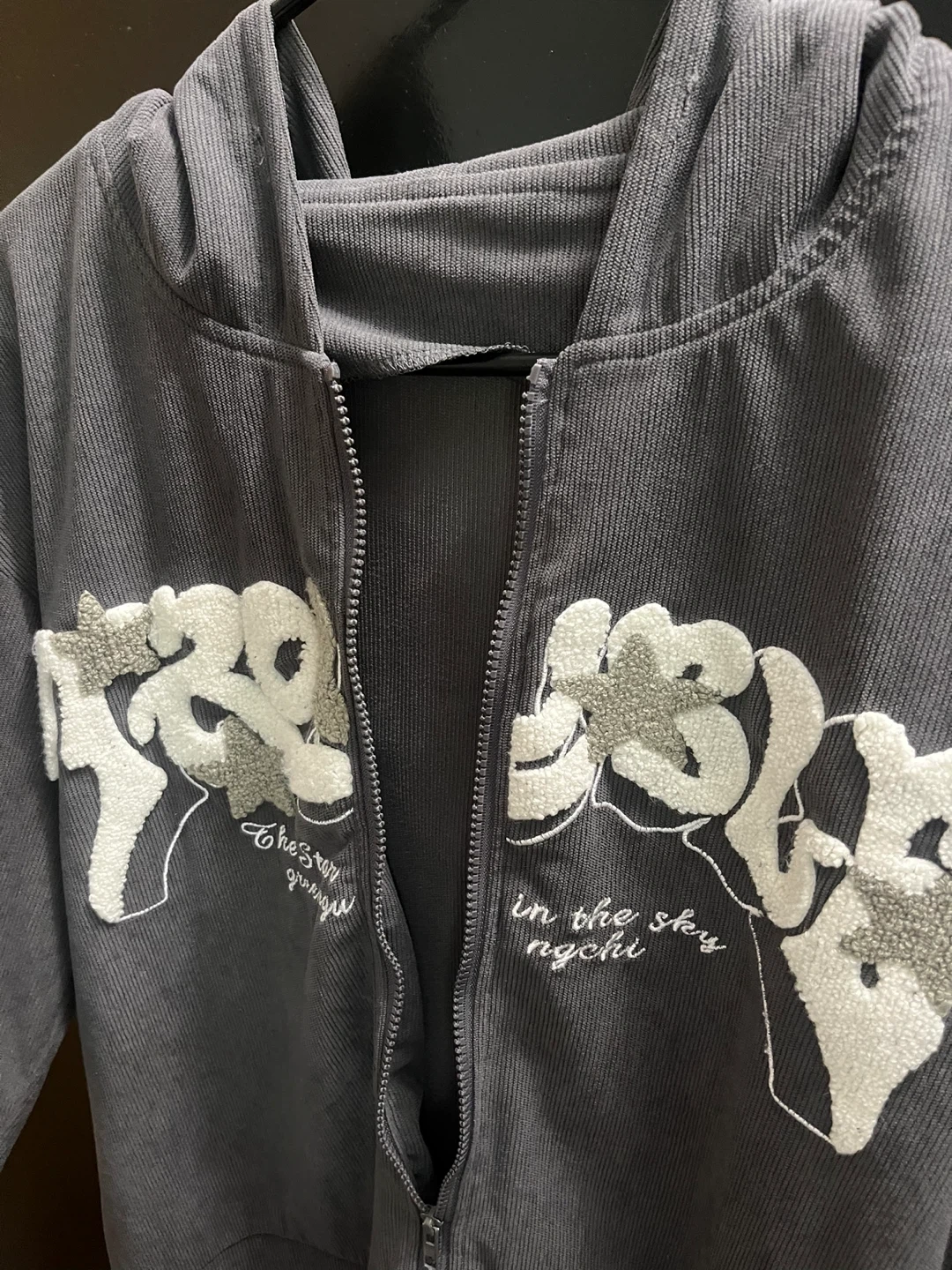 Selling a comfy grey corduroy zip-up hoodie It has a unique design with embroidered text and stars on the front. Light weight fabric