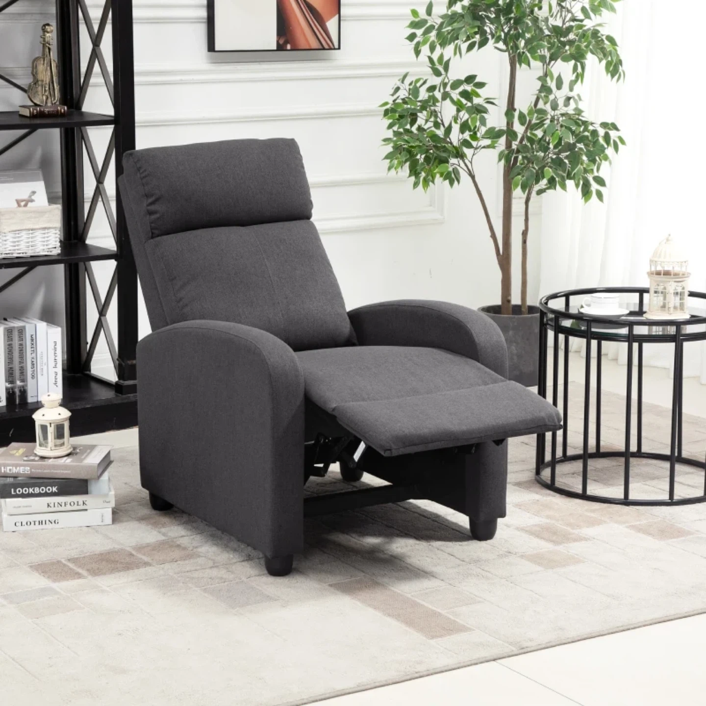 Selling a comfy grey fabric recliner chair. It's perfect for relaxing after a long day. The material is soft and durable, and the reclining feature works great. It's in good condition and ready for a new home!