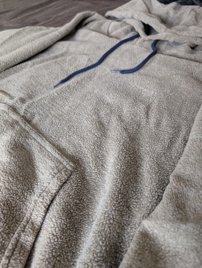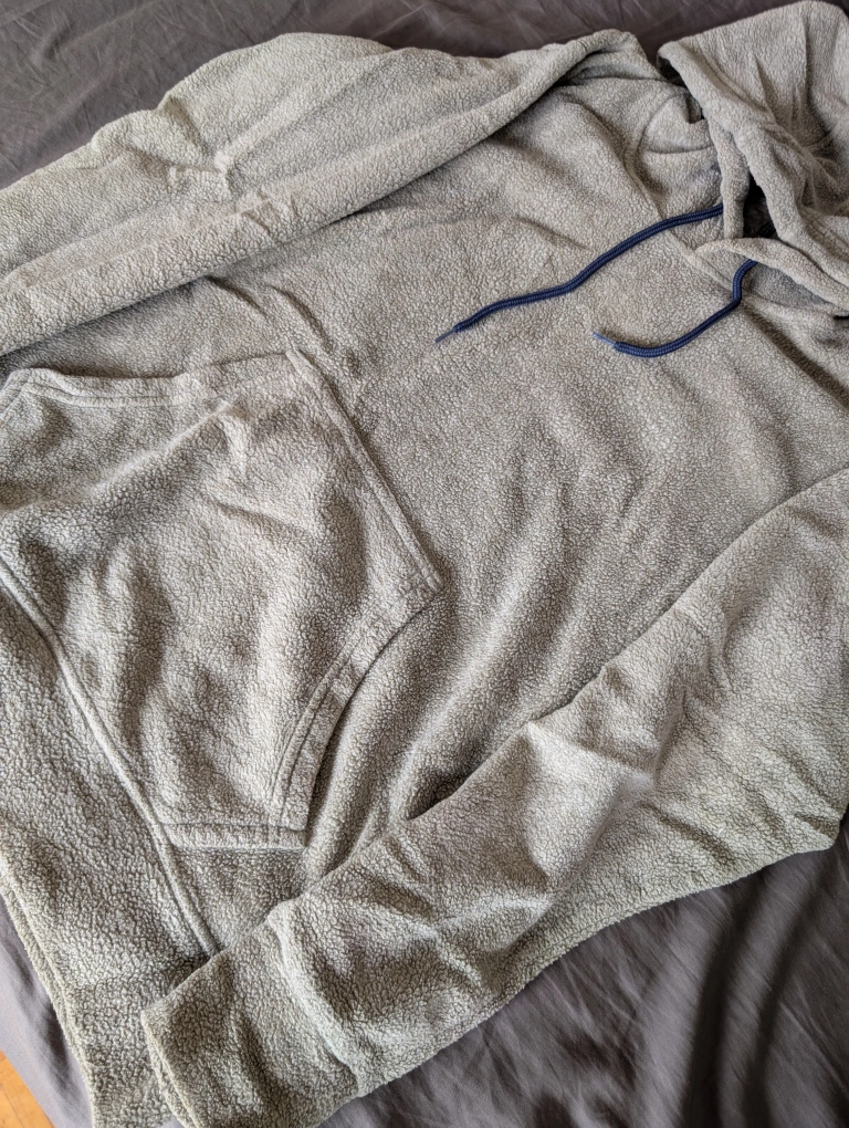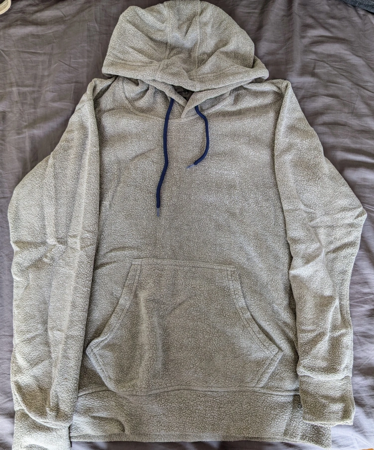 grey fleece hoodie. Long sleeves, kangaroo pocket. Drawstrings.