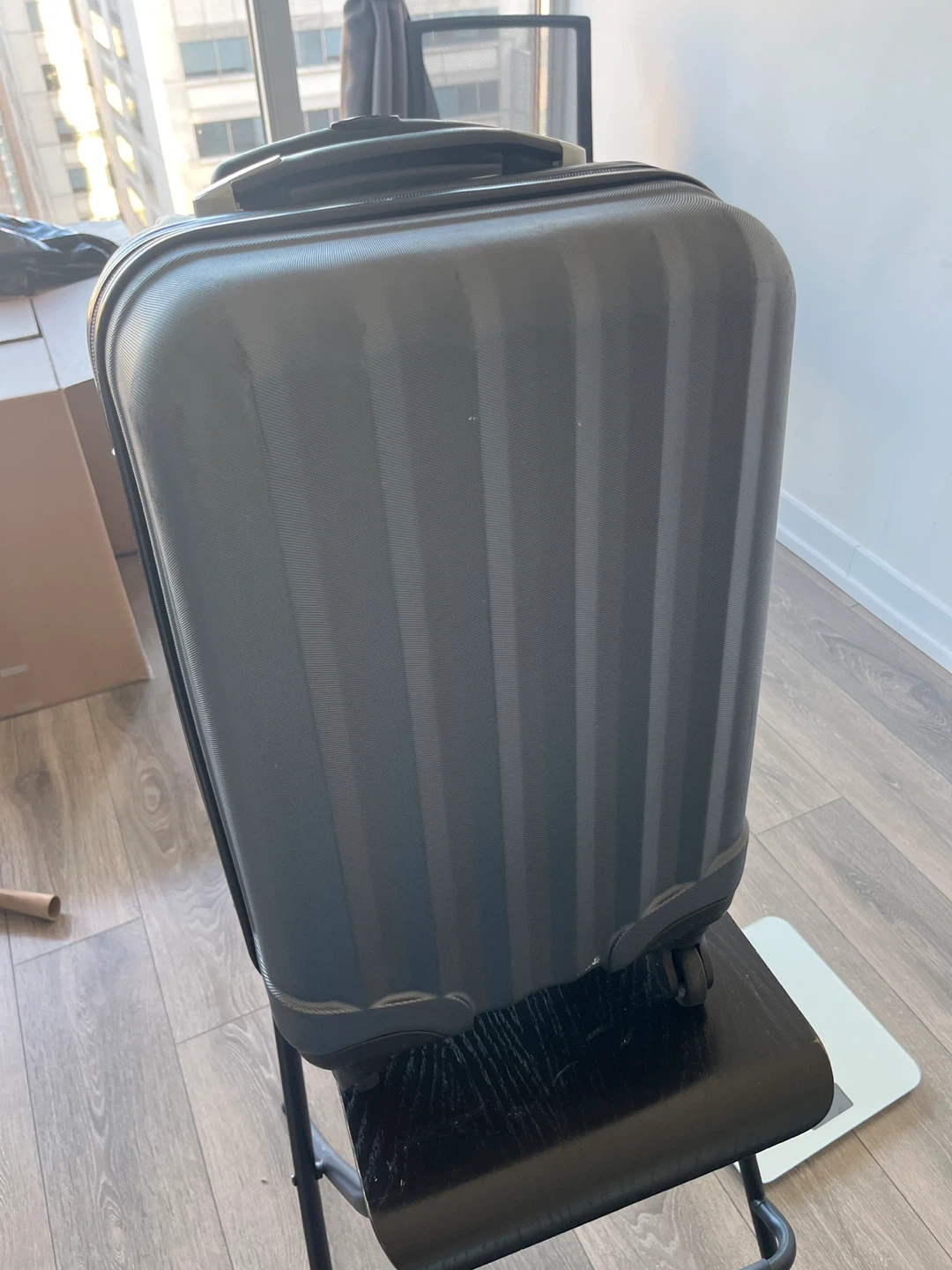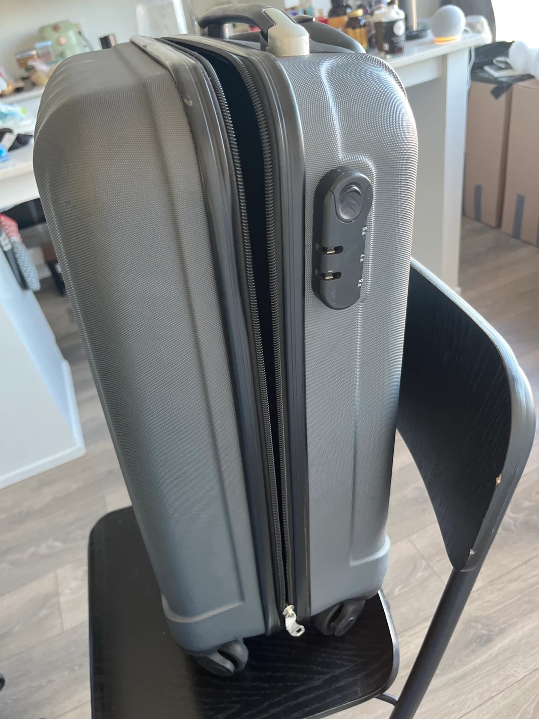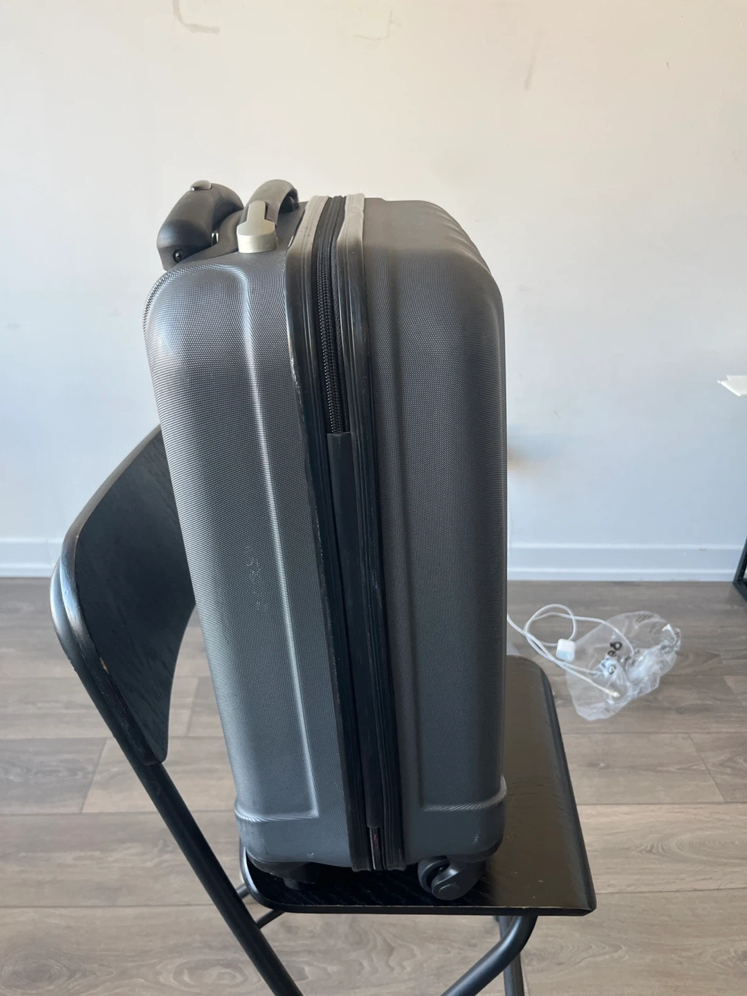 Selling a grey hardside carry-on suitcase. It's in great shape and ready for your next trip! Features a built-in combination lock for added security. Perfect for weekend getaways or business travel