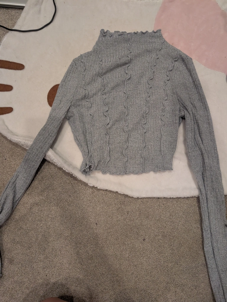 This is a grey long sleeve crop top. It has a mock neck and a lettuce edge hem. It's perfect for layering or wearing on its own!