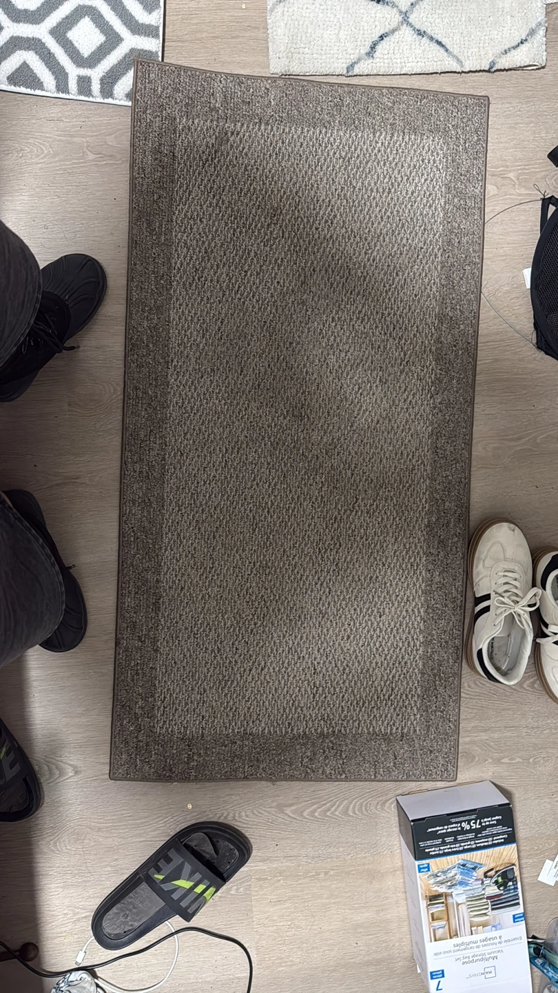 Selling a grey multipurpose rug. It appears to be in good condition, perfect for adding a touch of comfort to any room. The box says 'usages multiples' which makes it great for multiple uses around the house!