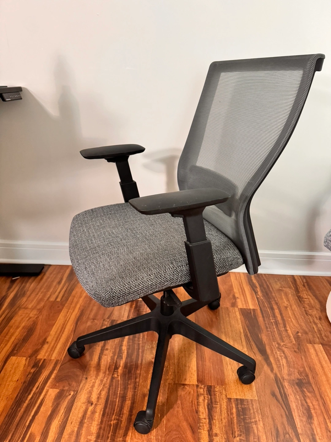 Selling a grey office chair that's in great shape! It features a comfortable mesh back, perfect for long hours at your desk. The seat is a textured grey fabric, and the base is a sturdy black. It's ready to help you work in comfort!