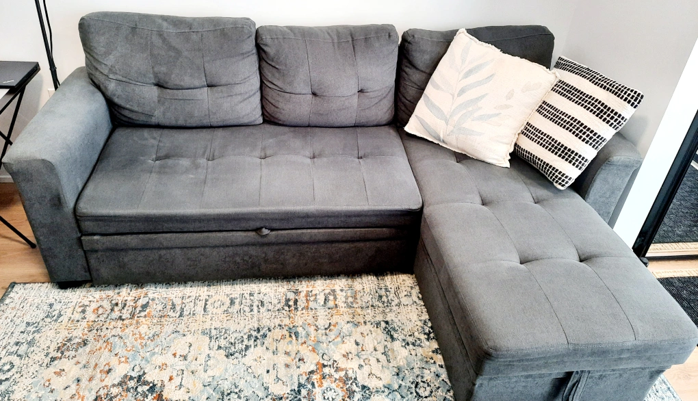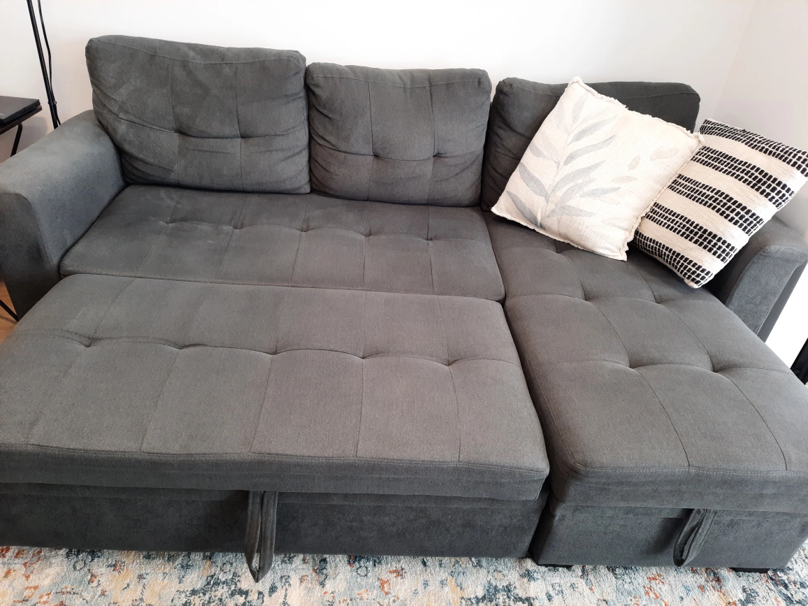 Grey sectional sofa bed with a pull-out bed. Includes storage space in the chaise lounge.with power connection for mobile /Laptop charging or data cabal..current market price is 1400CAD for new sofa.