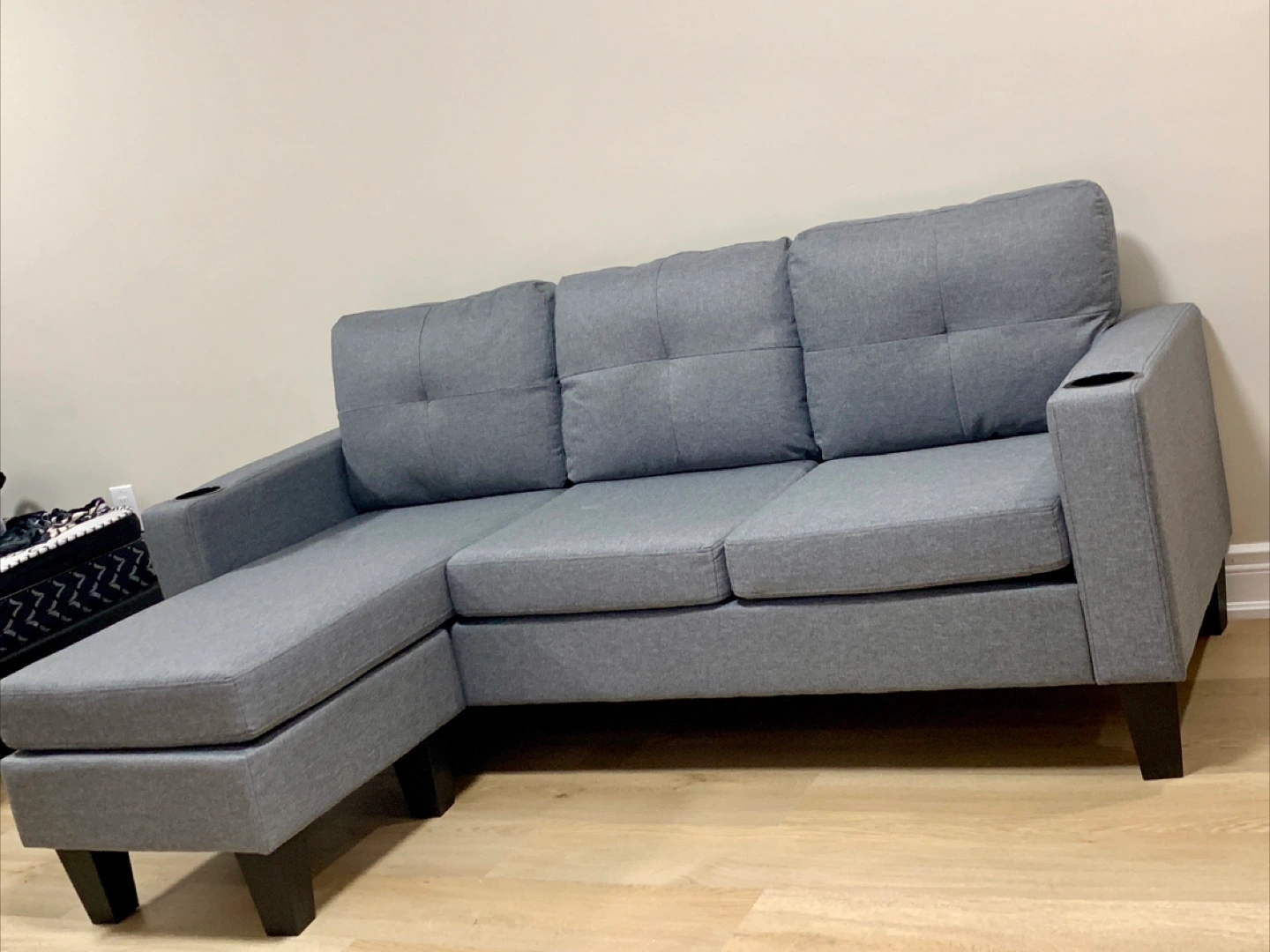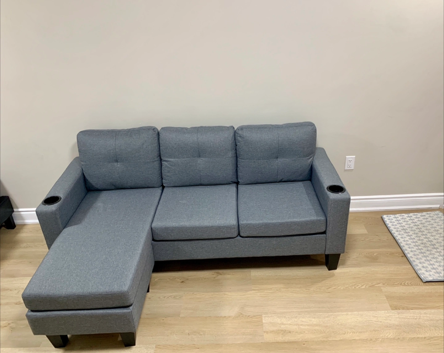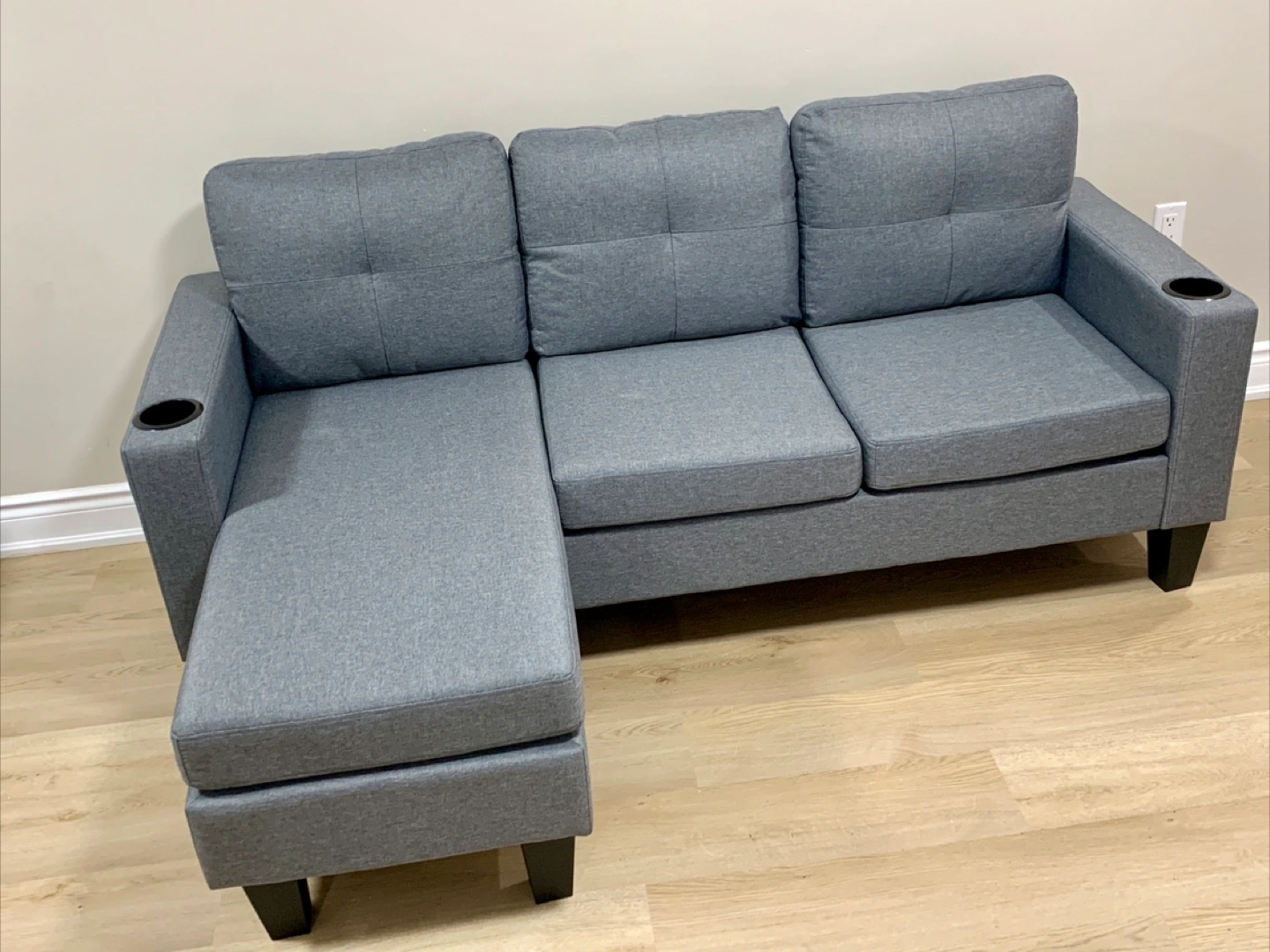 Selling a brand new comfy grey sectional sofa! It features a chaise lounge for extra relaxation and even has built-in cup holders on the armrests. Perfect for a living room or entertainment space