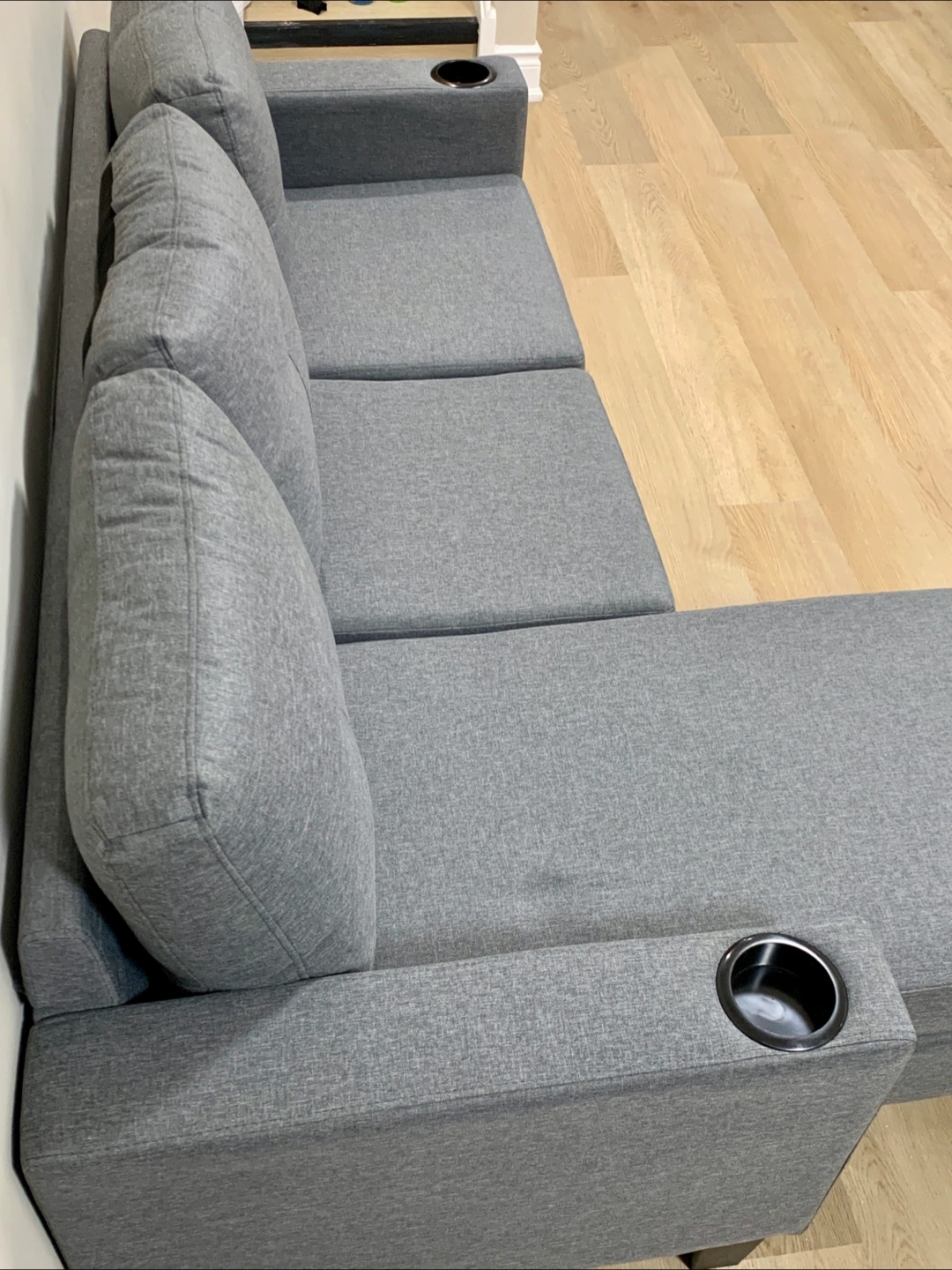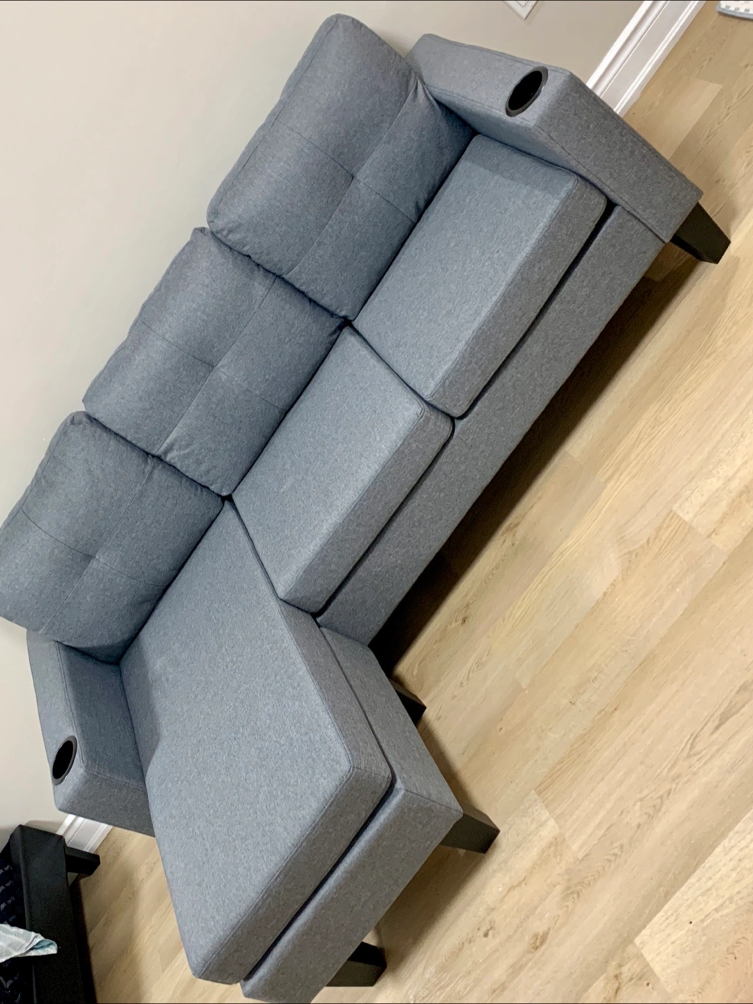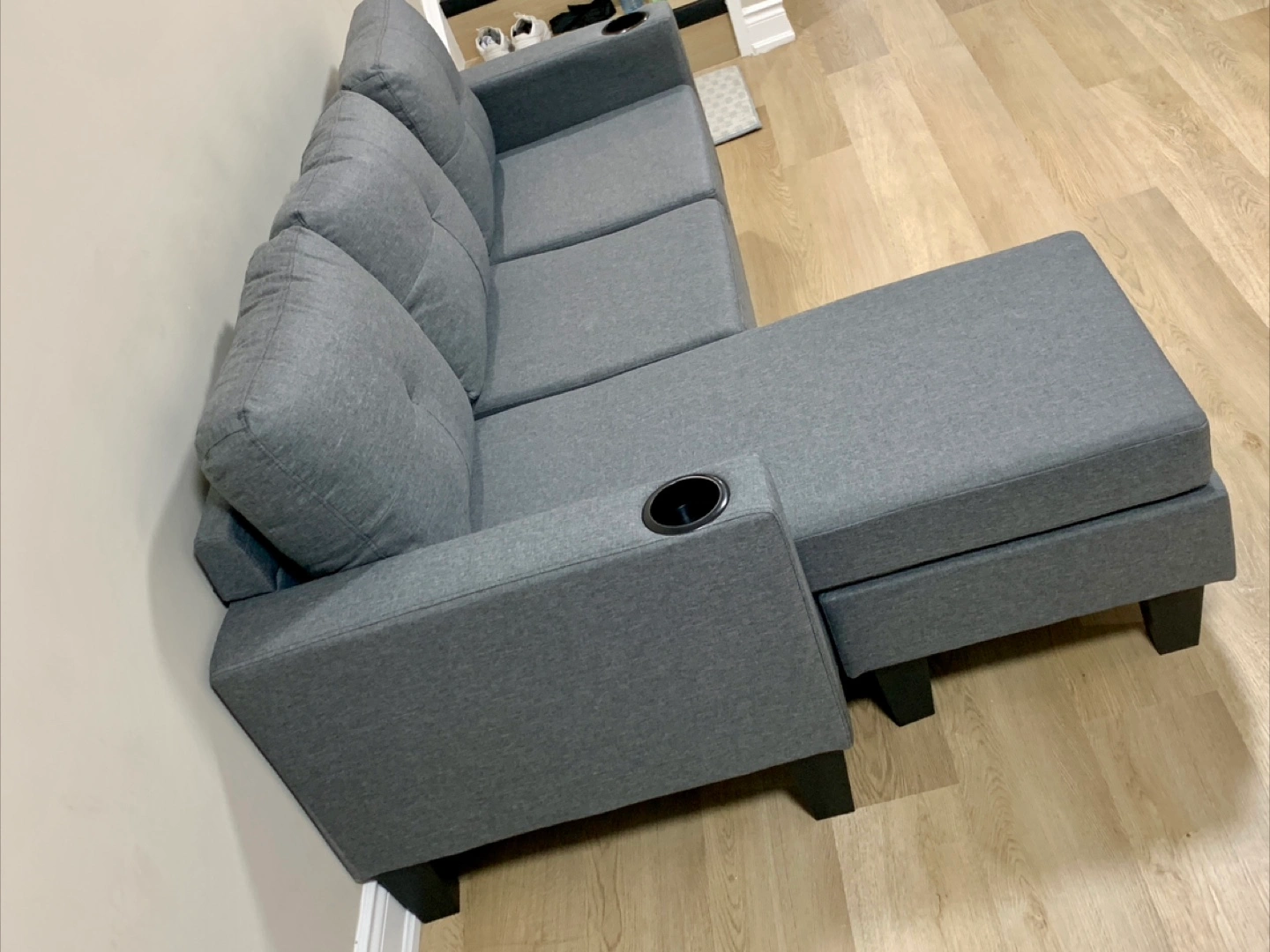 Selling a brand new comfy grey sectional sofa! It features a chaise lounge for extra relaxation and even has built-in cup holders on the armrests. Perfect for a living room or entertainment space