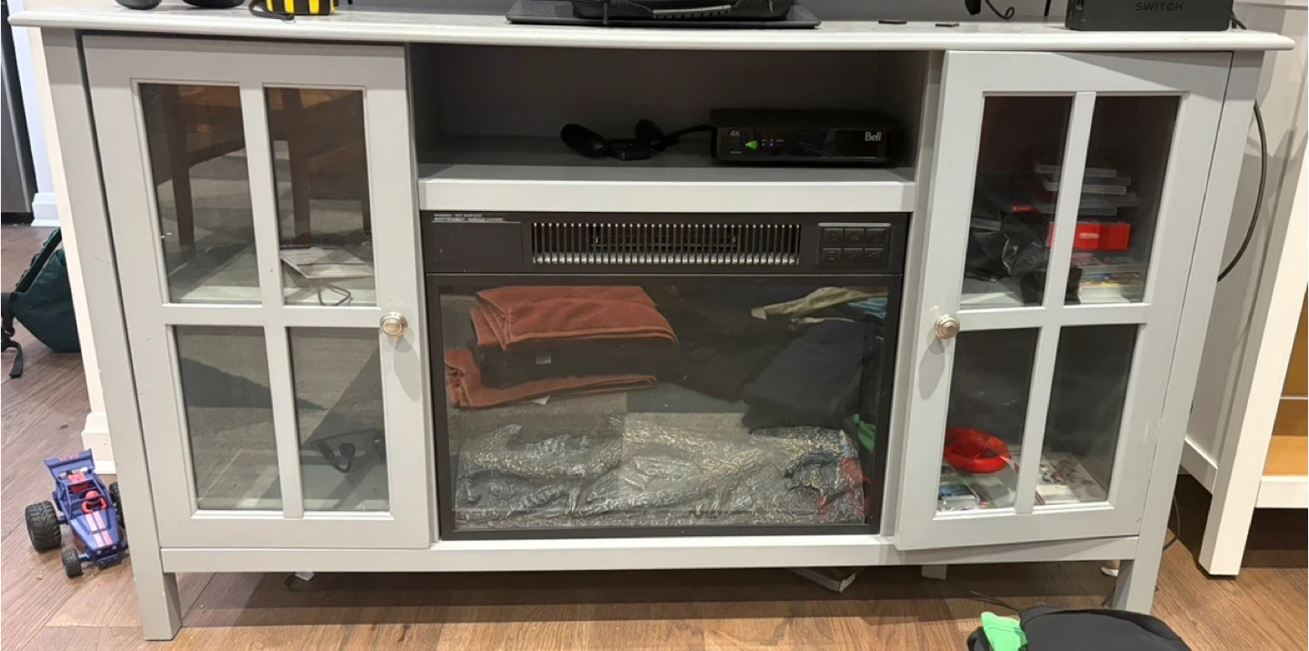 Selling a grey TV stand that also has an electric fireplace built in! It's a great piece of furniture to add a cozy touch to your living room. The stand has glass doors on either side for displaying items, and the fireplace adds warmth and ambiance