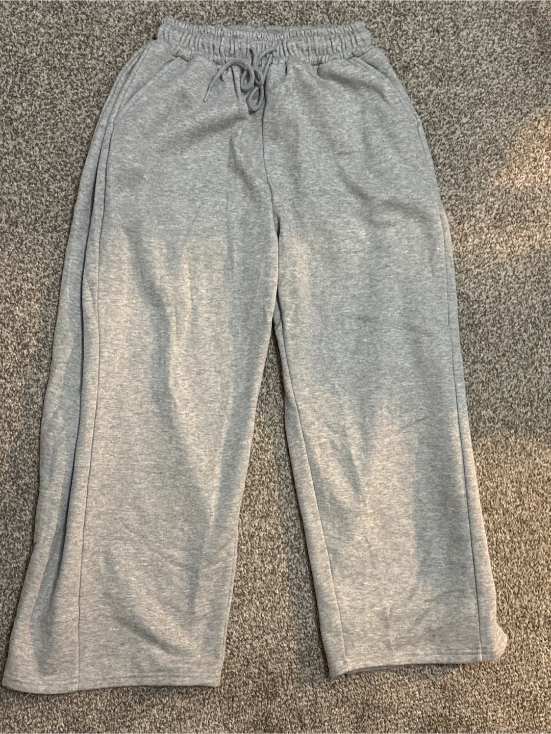 Selling a pair of comfy grey wide leg sweatpants! They're in great condition and perfect for lounging around the house or running errands. The material is soft and cozy, making them ideal for cooler weather. They have a relaxed fit and a drawstring waist for added comfort If your height is 155cm~158cm it will fit great