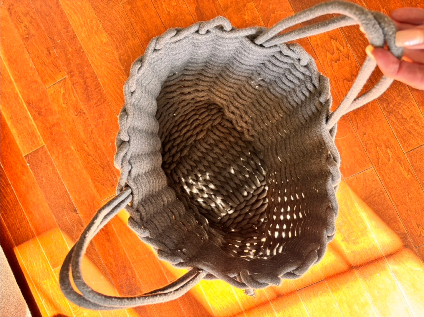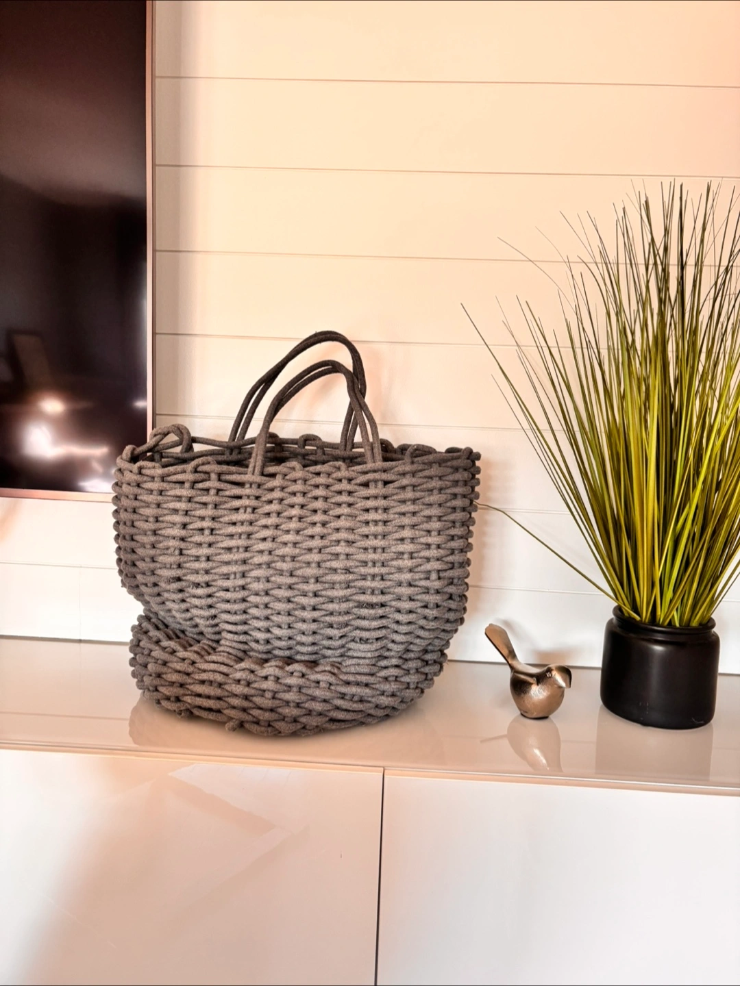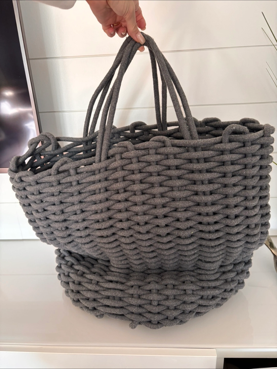 Selling a lovely grey woven rope basket from Structube It's in great condition and perfect for storage or decor. The basket has a unique woven texture and sturdy handles, making it both practical and stylish for any room in your home great for blankets, balls of yarn etc $25 firm. No holds. Pick up only