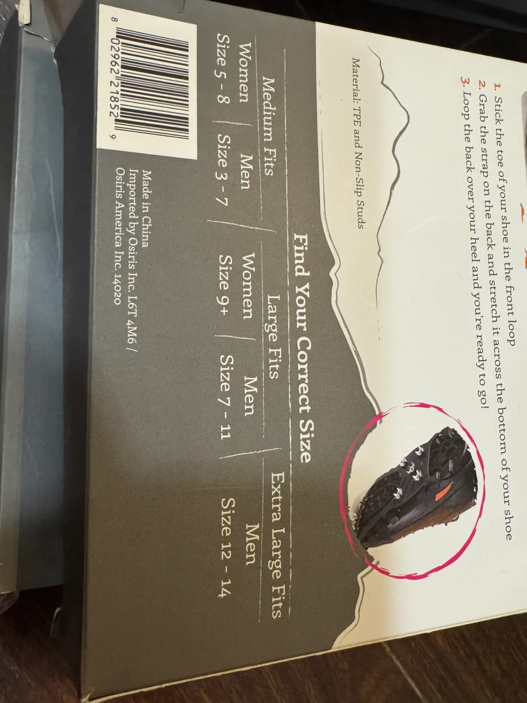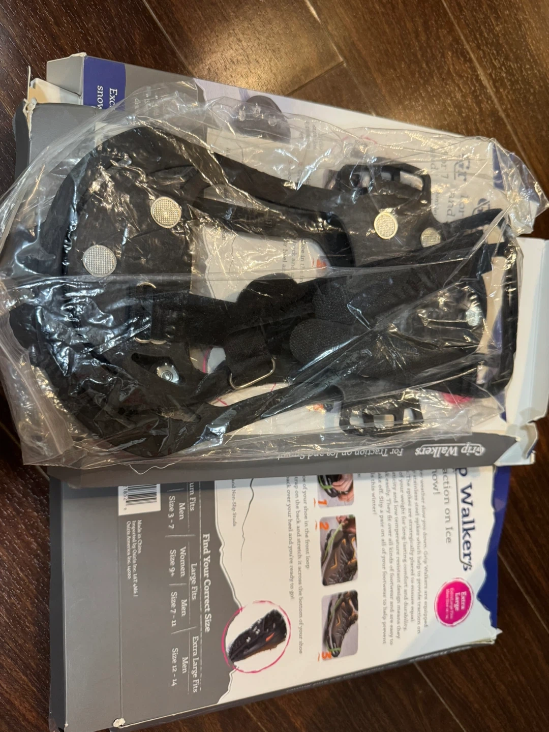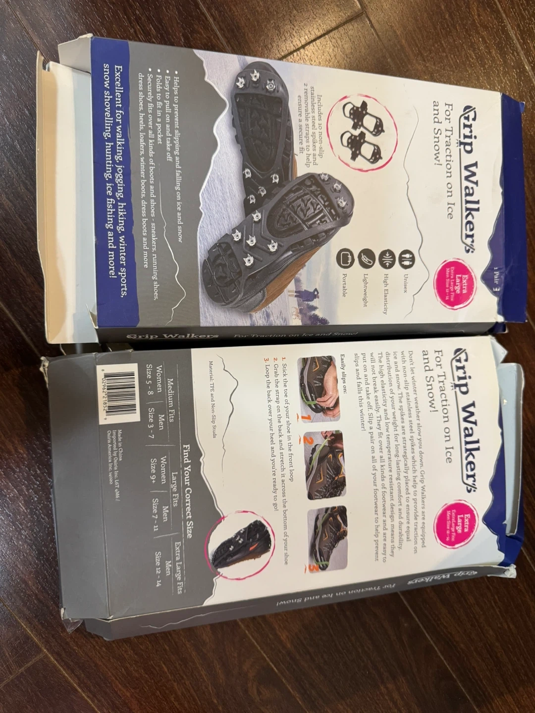 Grip Walkers for traction on ice and snow! These are excellent for walking, jogging, hiking, winter sports, snow shovelling, hunting, ice fishing and more! - Foldable to fit in a pocket - Securely fits over all kinds of boots and shoes: sneakers, work boots, dress shoes, heels, loafers, winter boots, dress shoes and running shoes Includes 2 removable straps and 2 replaceable straps to help ensure a secure fit it's brand new 1 for 5 2 for 8 3 for 10 4 for 13