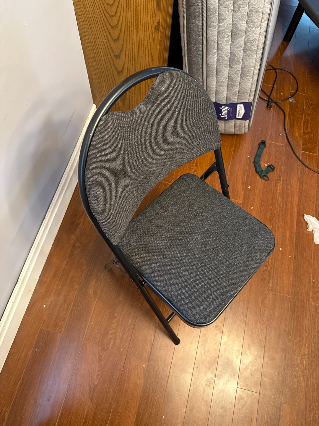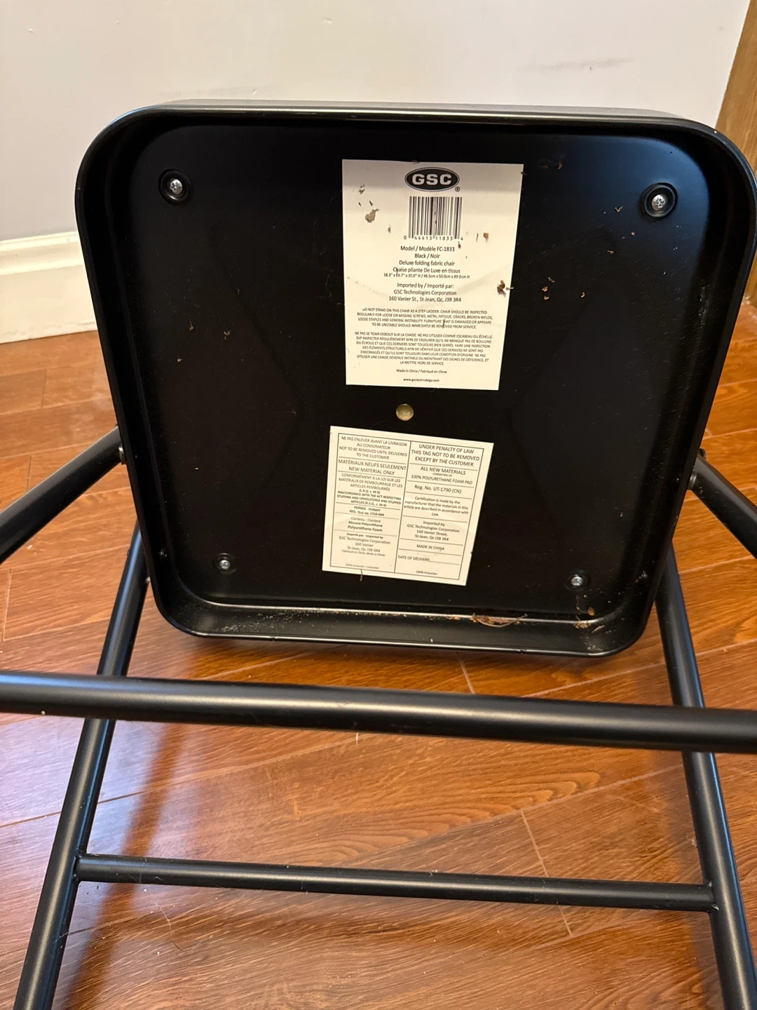 Selling a GSC Deluxe Folding Fabric Chair in black and grey! This chair features a comfortable fabric seat and back, perfect for extra seating when needed. It's easy to fold and store when not in use. The chair is made of 100% polyester fabric and new materials only.