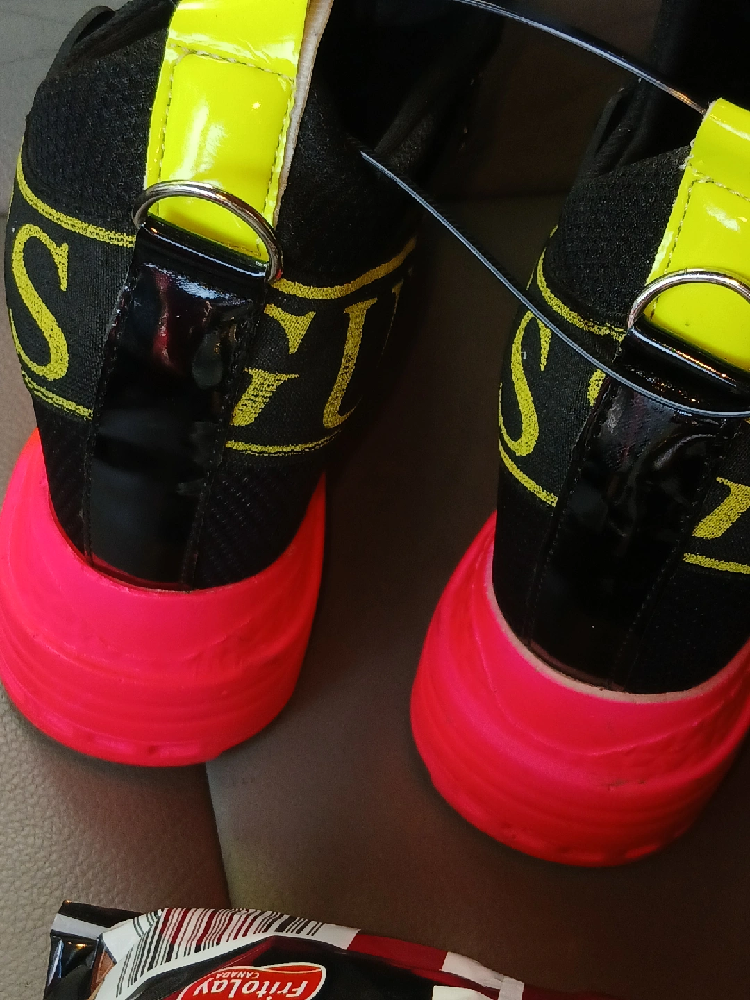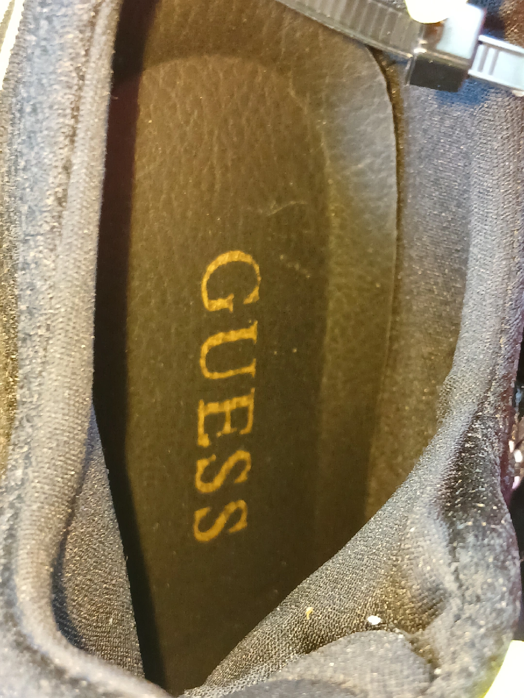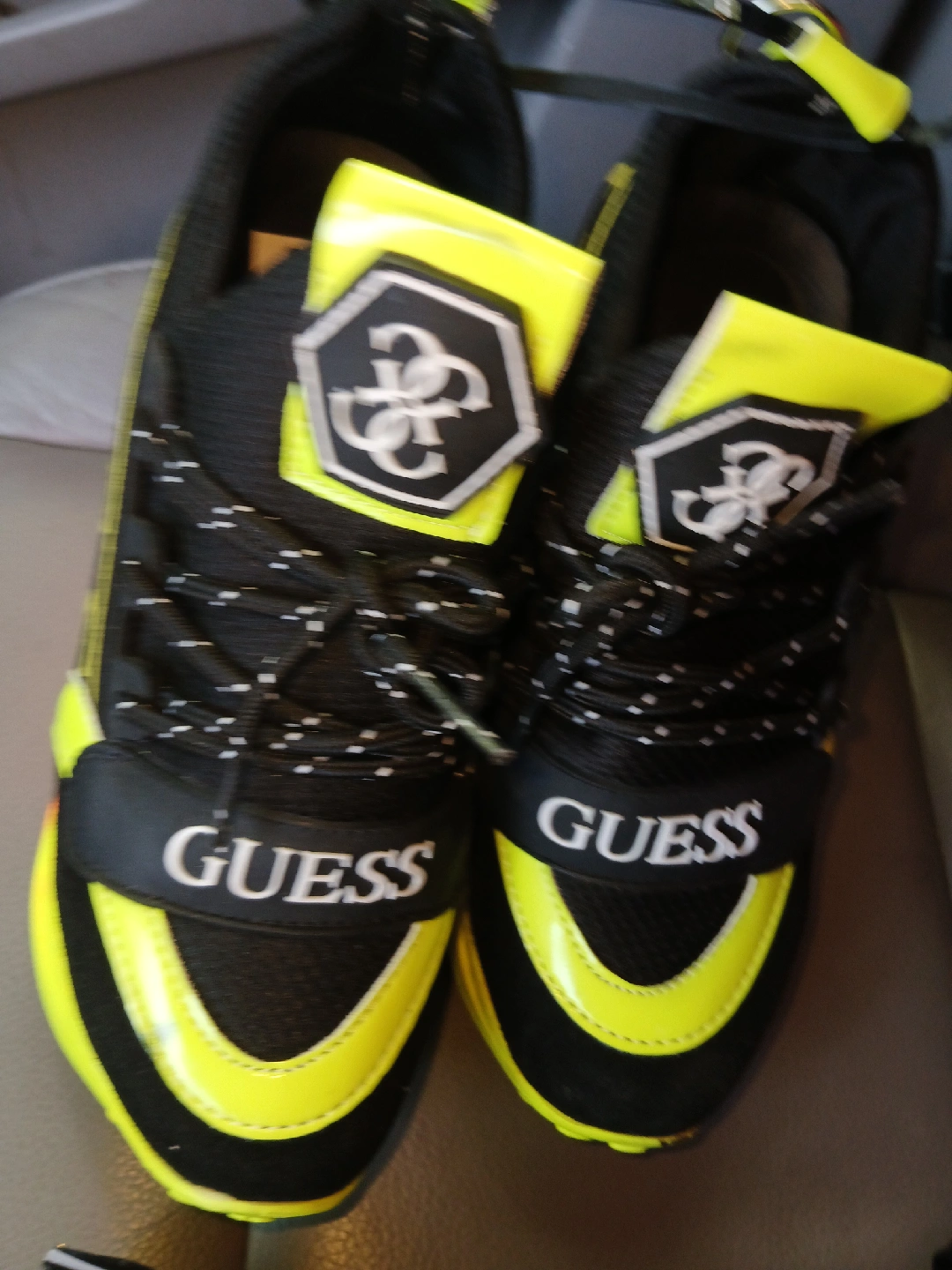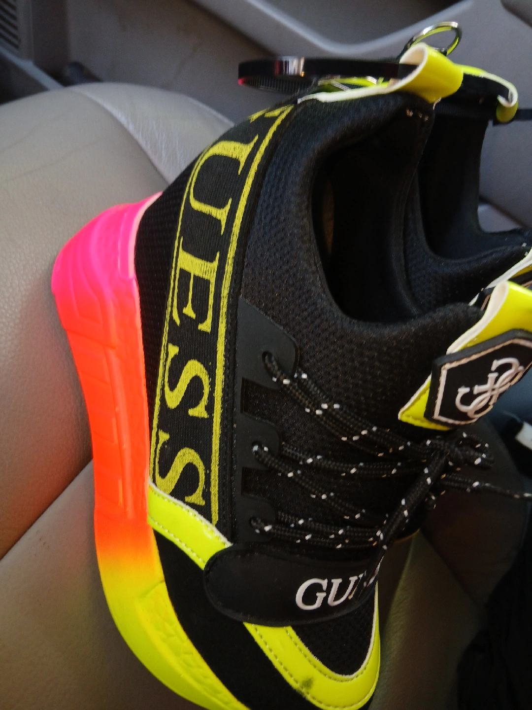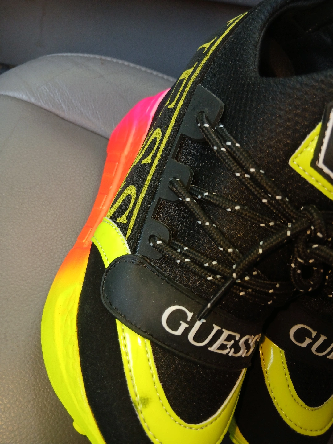 Selling a pair of Guess sneakers in black with neon yellow accents. The soles have a striking pink and orange gradient. They are in good condition and ready for a new home!