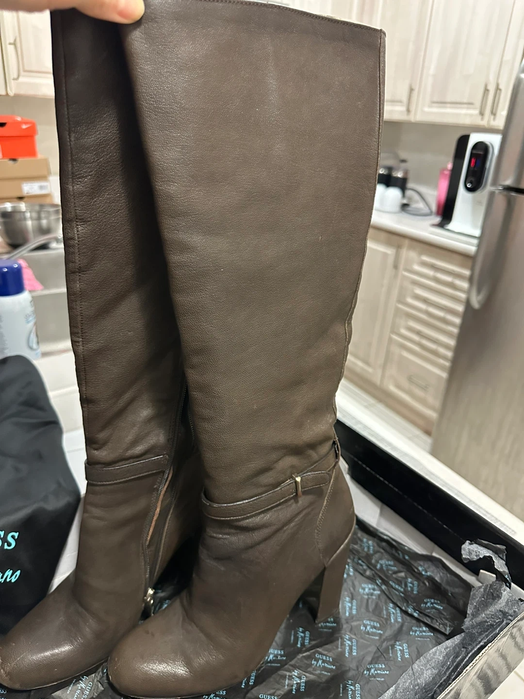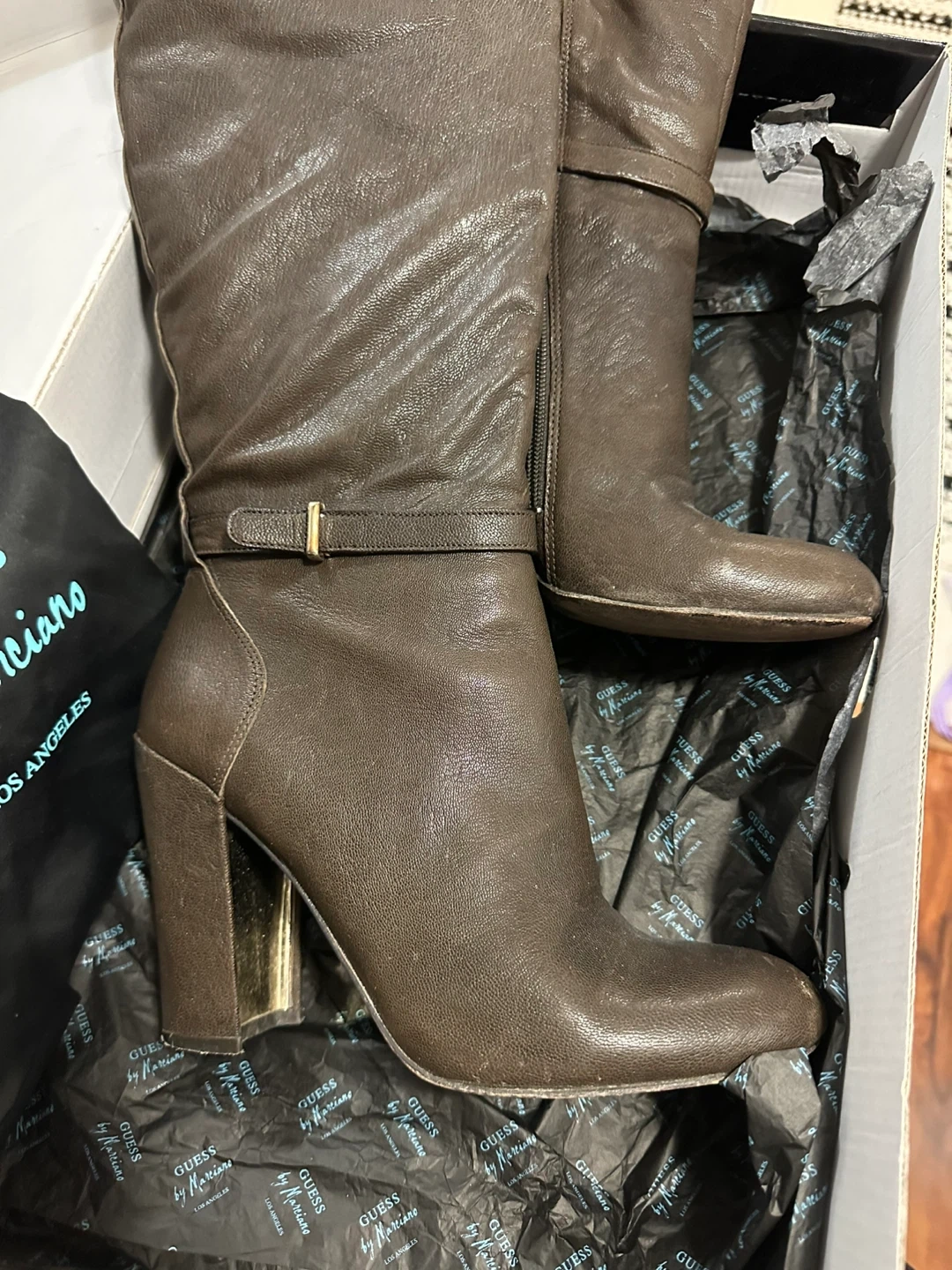 Selling a pair of Guess by Marciano knee-high boots in dark brown leather. These are a size 8.5 and come in the original box! The boots have a stylish heel and a strap detail. They are in really good condition and ready for a new home