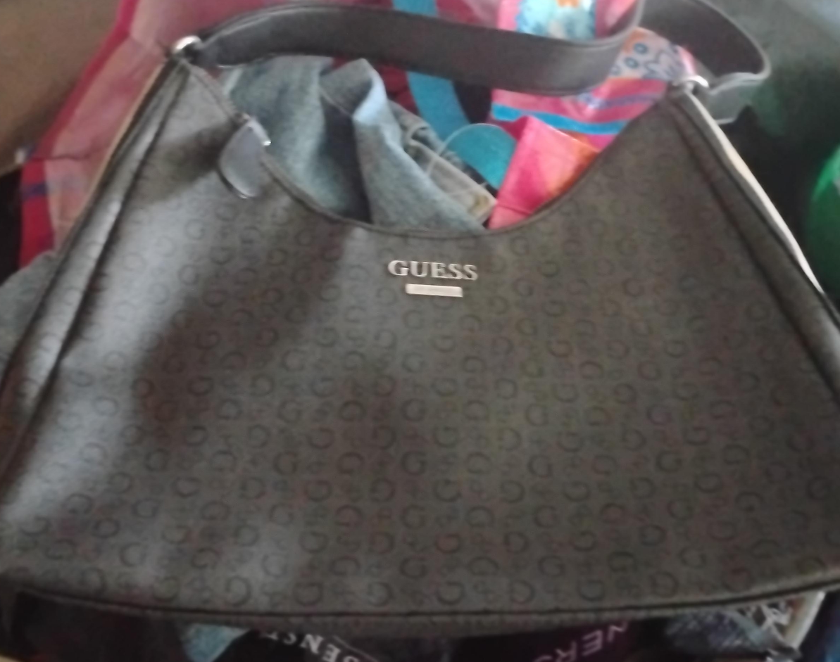 Here's a Guess handbag. It has a pattern of G logos all over. The strap is in great condition!