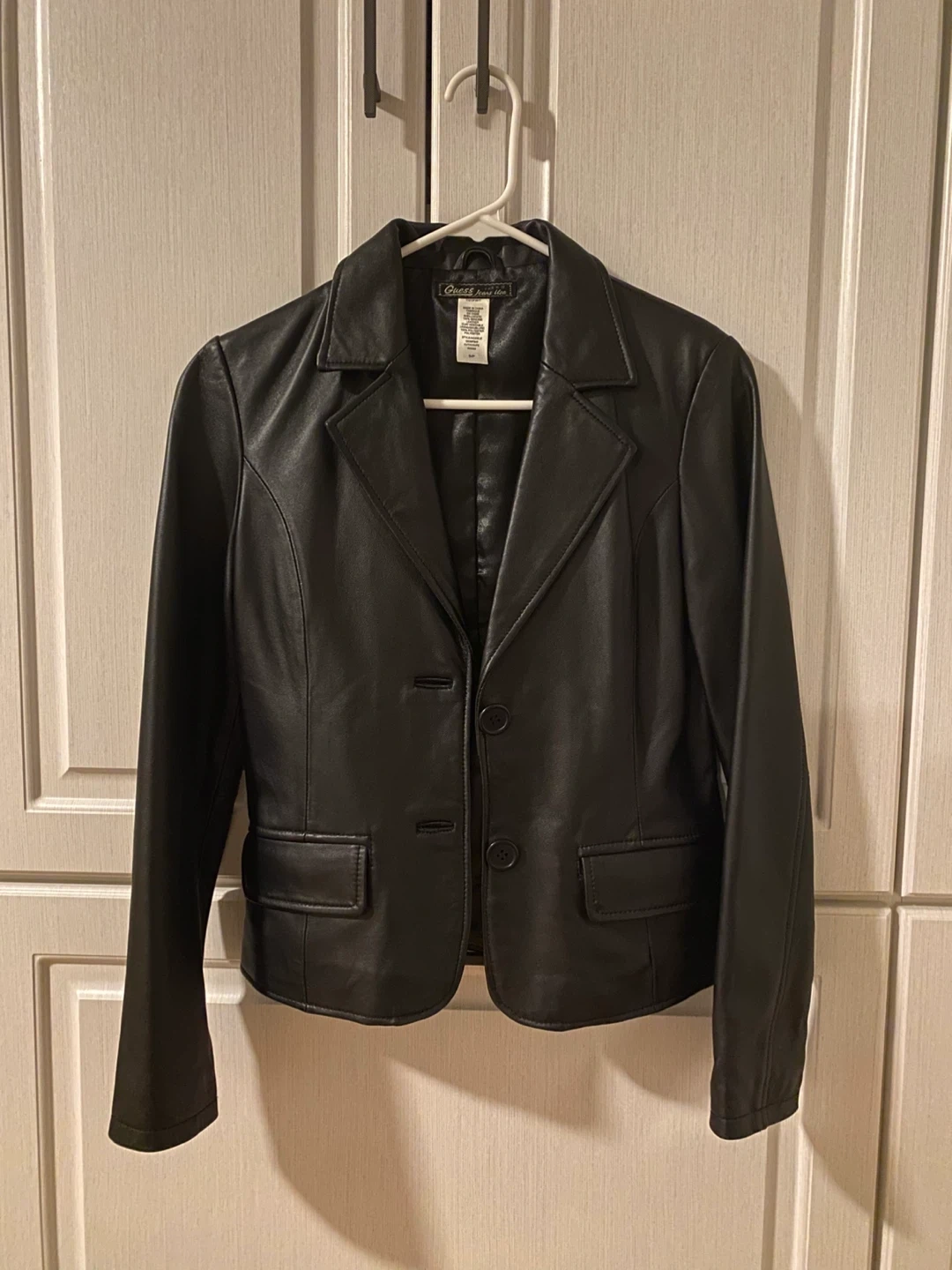This stylish Guess leather jacket is made from 100% genuine leather and features a sleek, fitted design, perfect for adding a touch of edgy sophistication to any outfit. This jacket has been worn once and is in great condition. Features: * Brand: Guess * Material: 100% Genuine Leather * Lining: 100% Polyester * Size: Small Looking for a jacket that’s as unique as you are? Well, look no further! If the ad is up, the jacket is available!