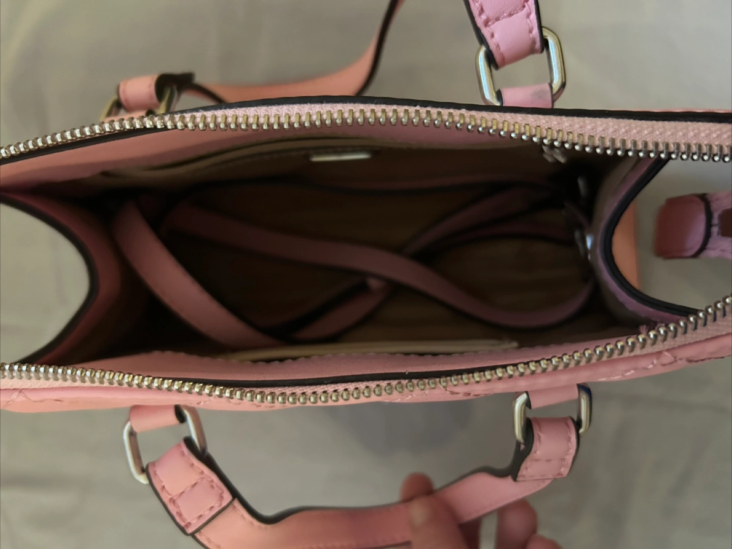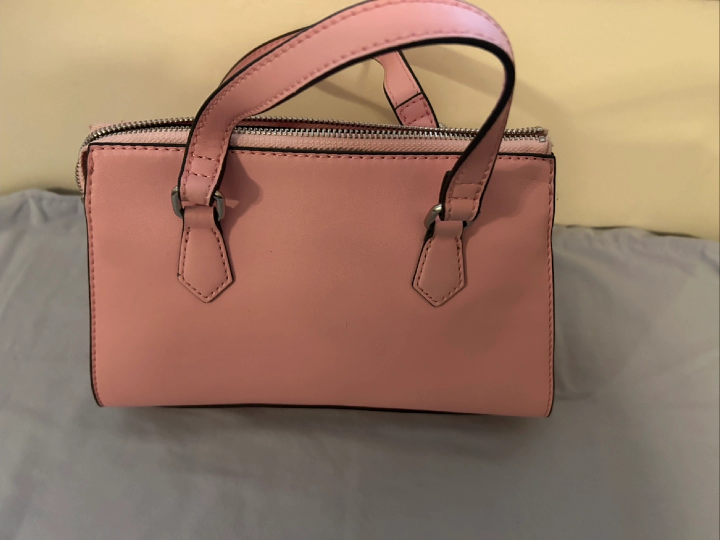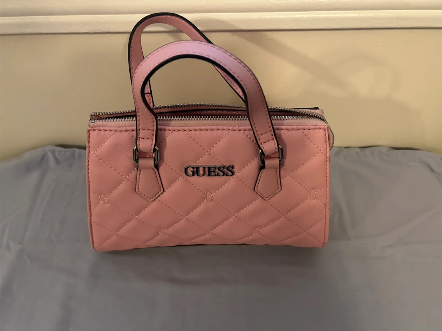 Selling a cute Guess mini satchel bag in pink! It's in great condition and perfect for carrying your essentials. The bag features a zip closure and a quilted design with the Guess logo subtly patterned throughout