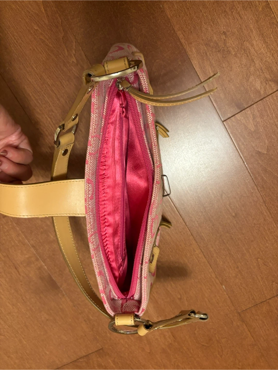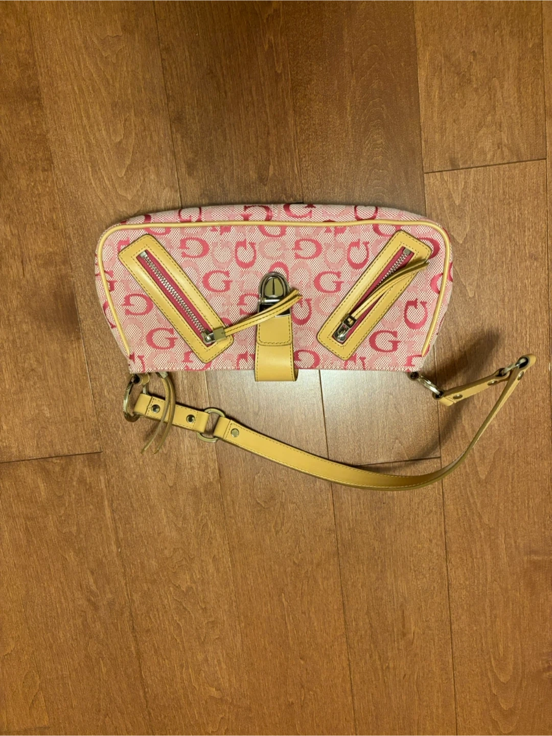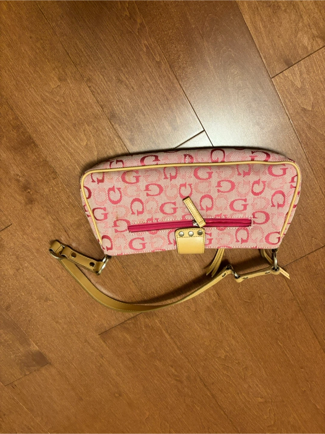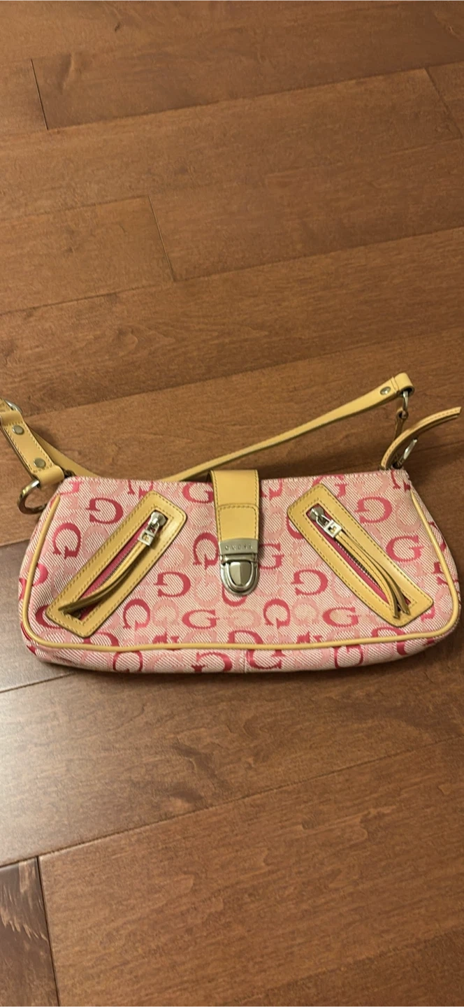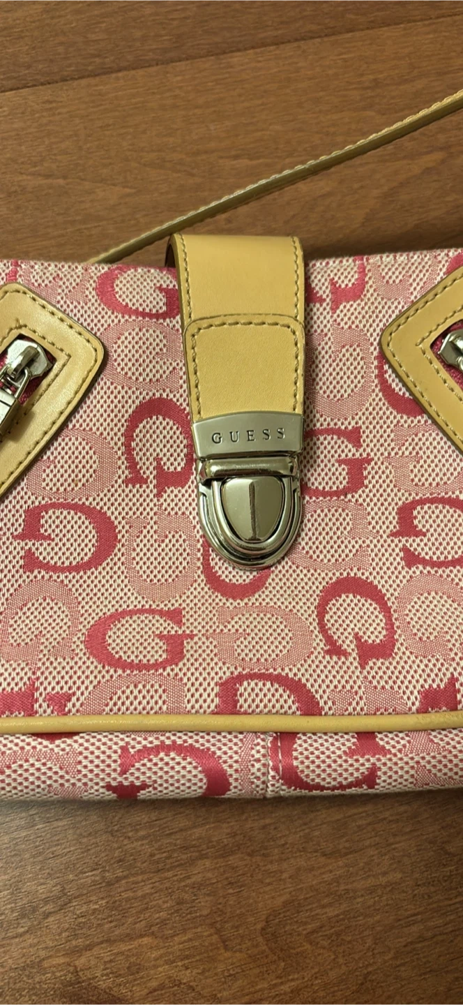 Selling a cute Guess shoulder bag! It features a pink patterned design with tan accents and a secure clasp closure. Perfect for adding a pop of colour to your outfit!