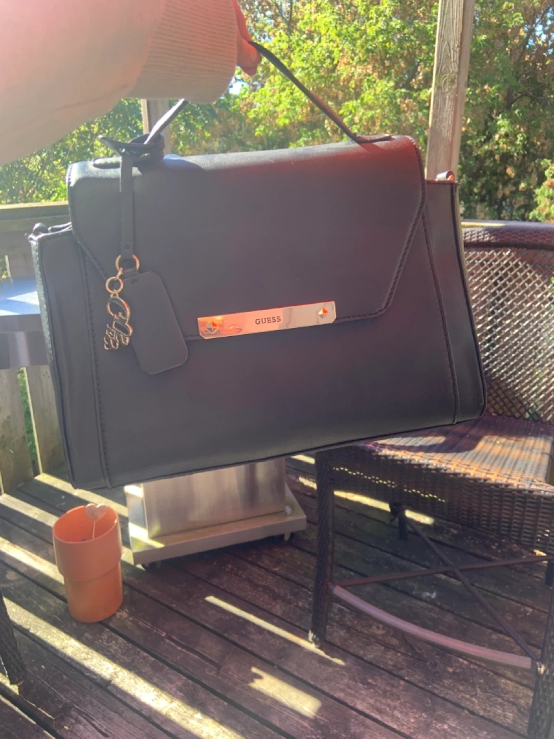 Guess Purse Black with gold accents Monogram pattern lined inside Comes with the cross body strap & guess bag charm. Fair condition. Used lightly.