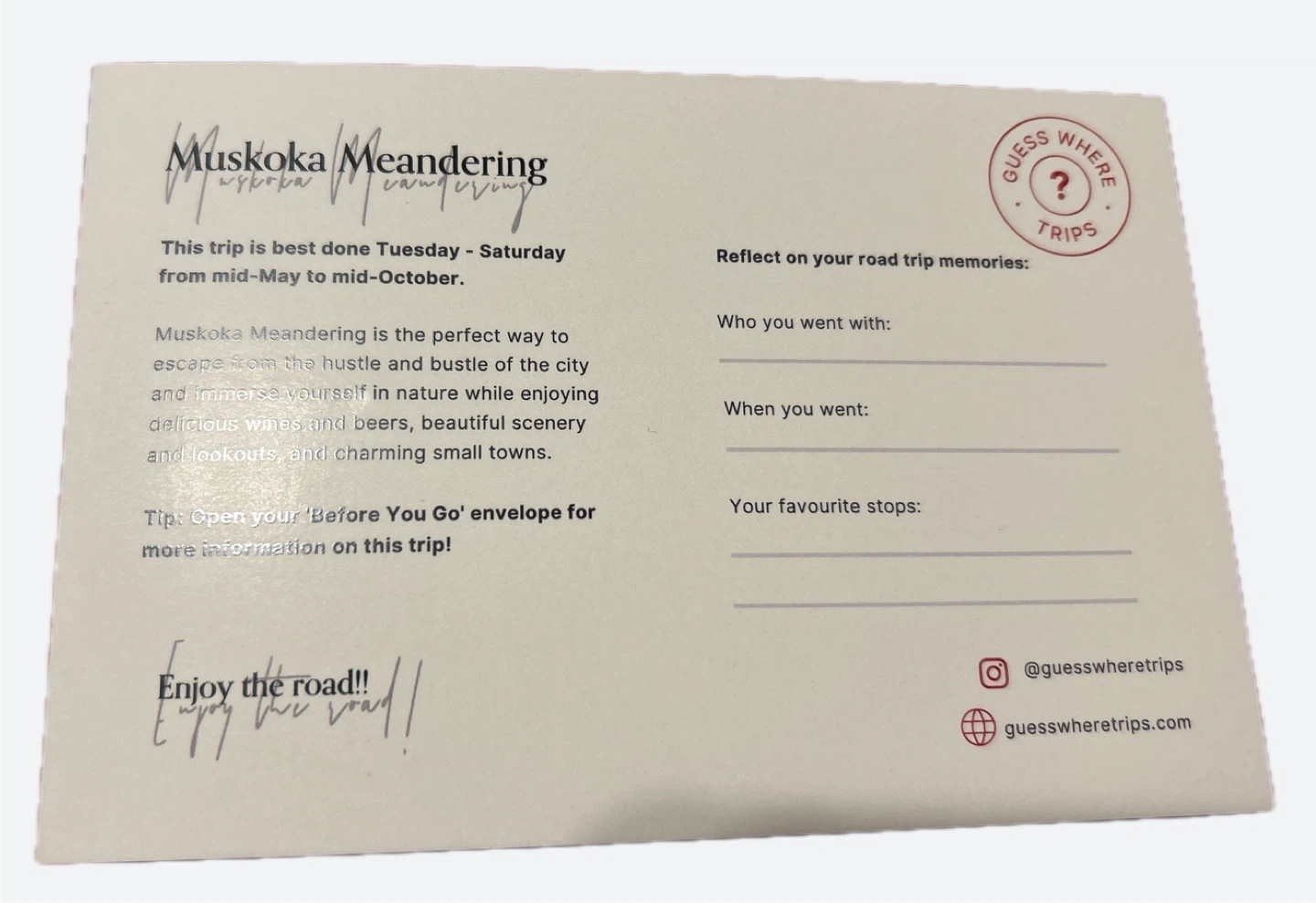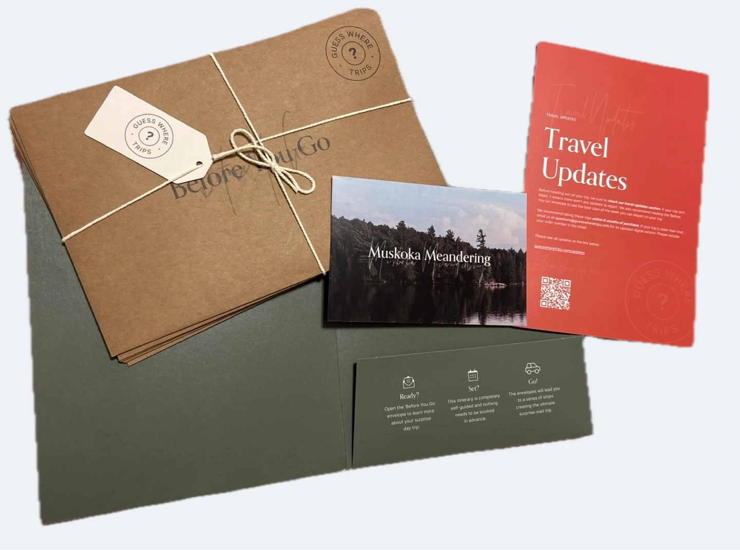 Get ready for a surprise adventure with the 'Guess Where Trips: Muskoka Meandering' package! This self-guided tour includes everything you need for a fun day trip. It's the perfect way to escape the city and enjoy nature, wineries, and charming small towns. Enjoy the road! Asking $25, pickup Scarlett and Eglinton. Cash only Includes envelopes with 4 stops, used once, like new gift-able.