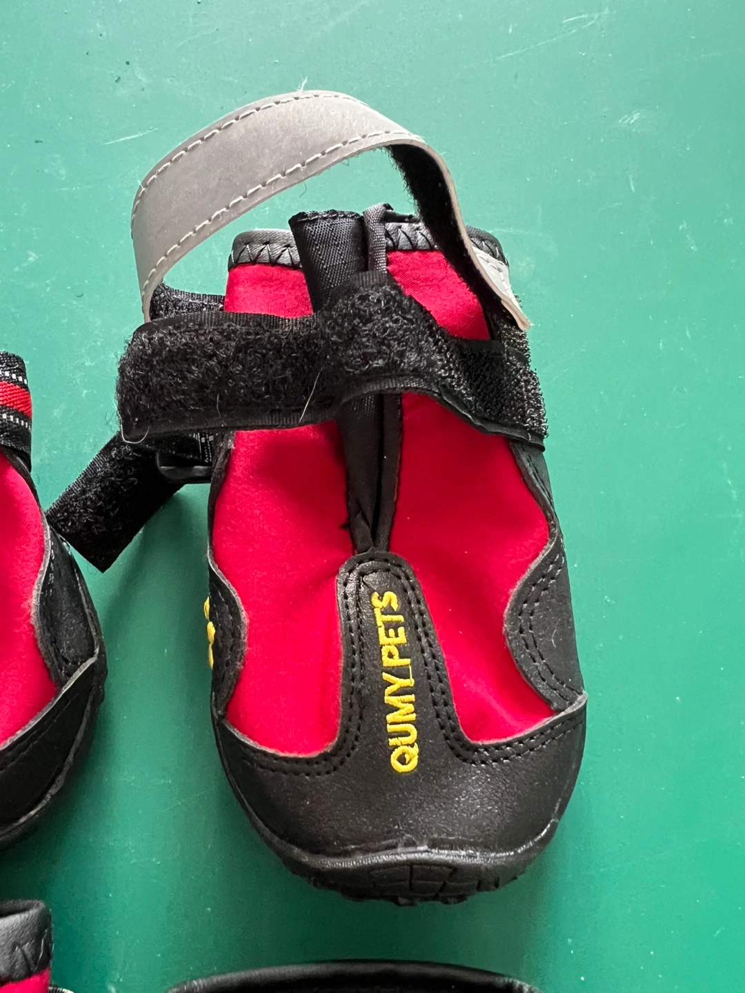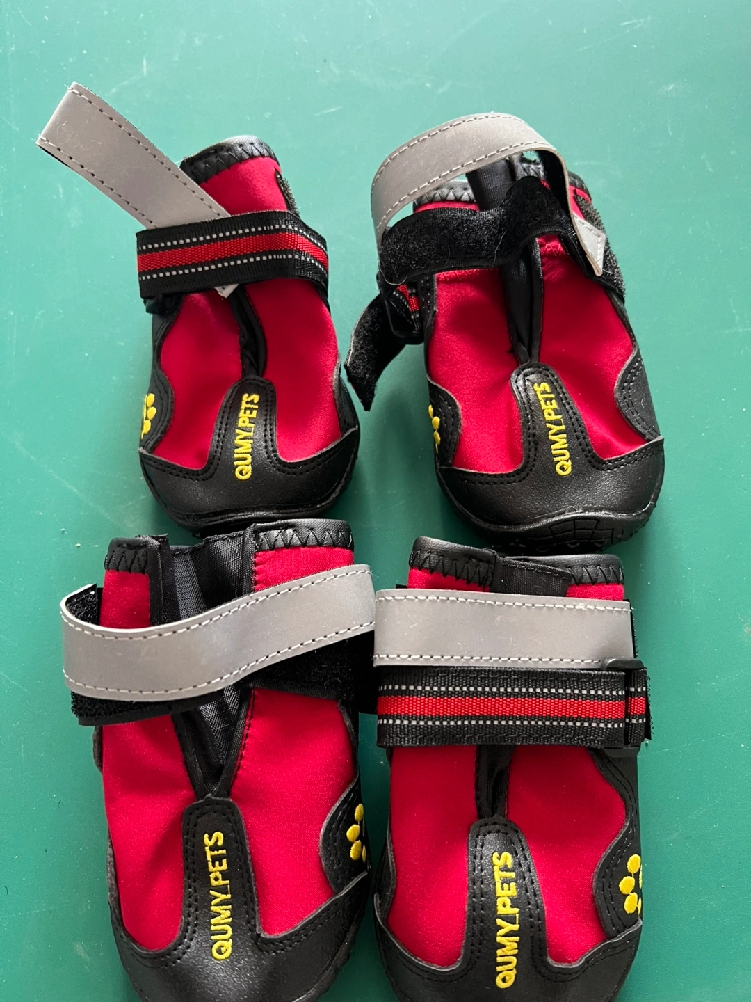 Set of four red and black dog boots. Durable, water-resistant material. Velcro closures for a secure fit. Good traction. Medium size. W 3”. I bought for my black lab, she said absolutely not - so brand new and looking for a home