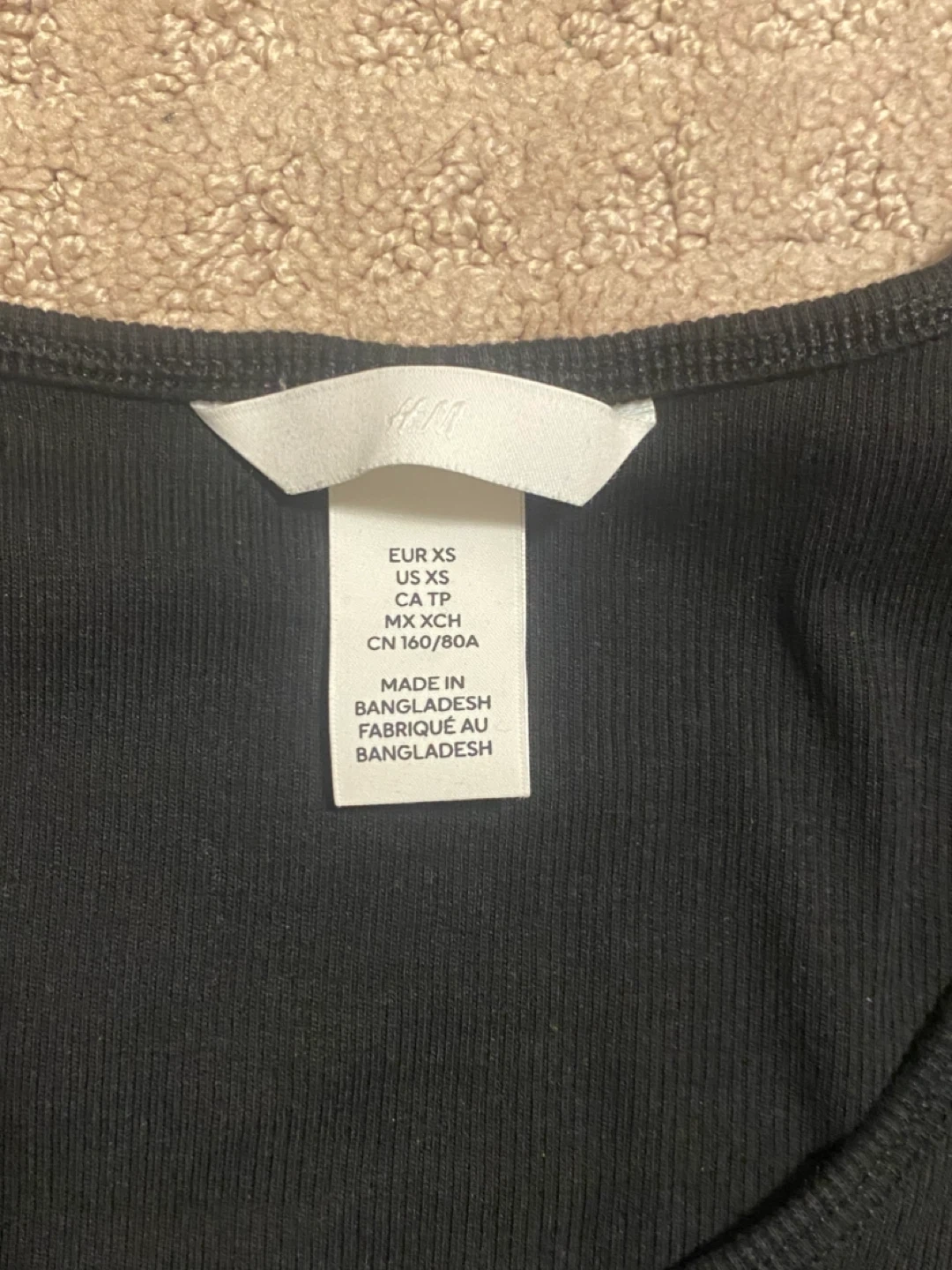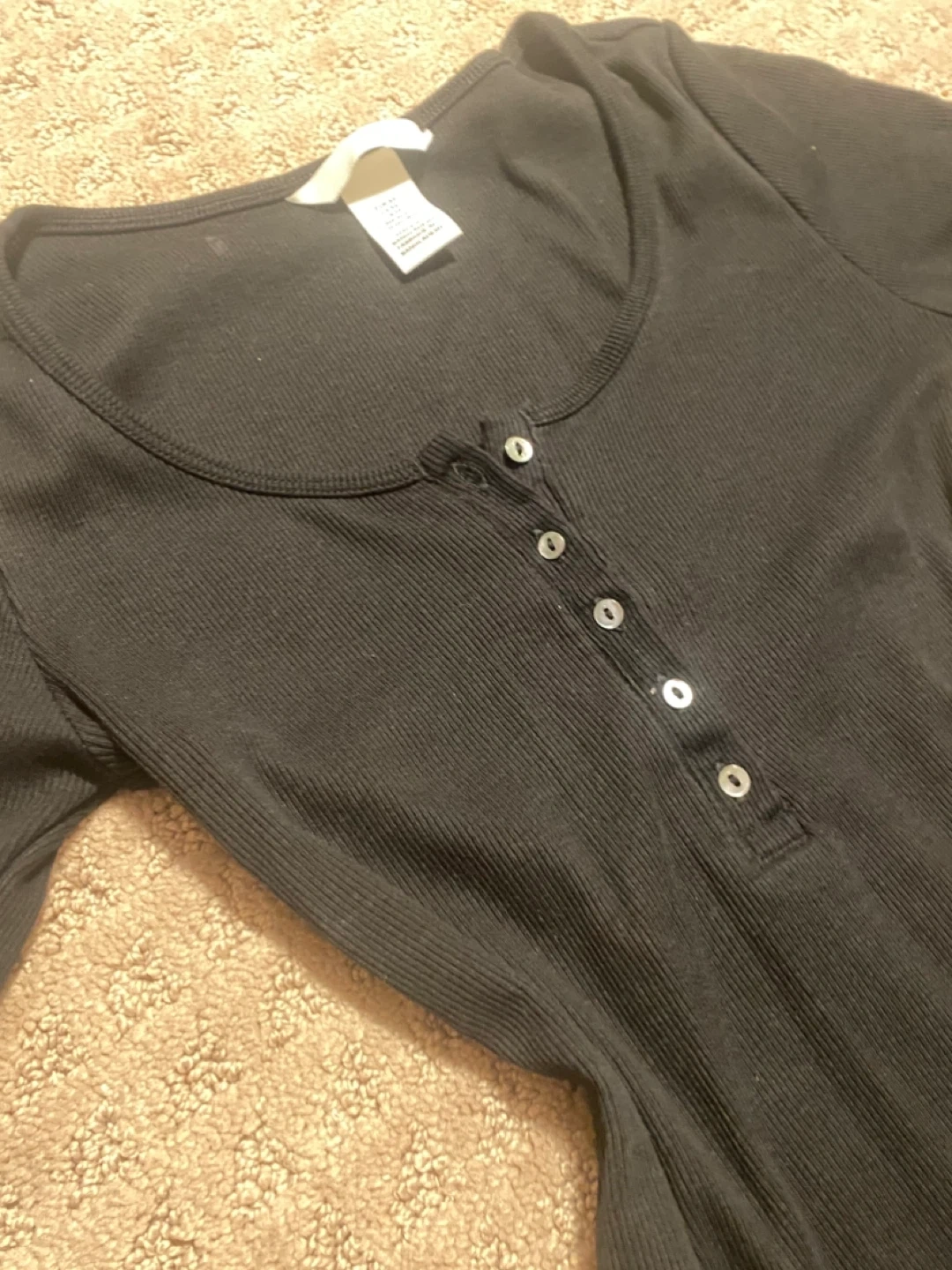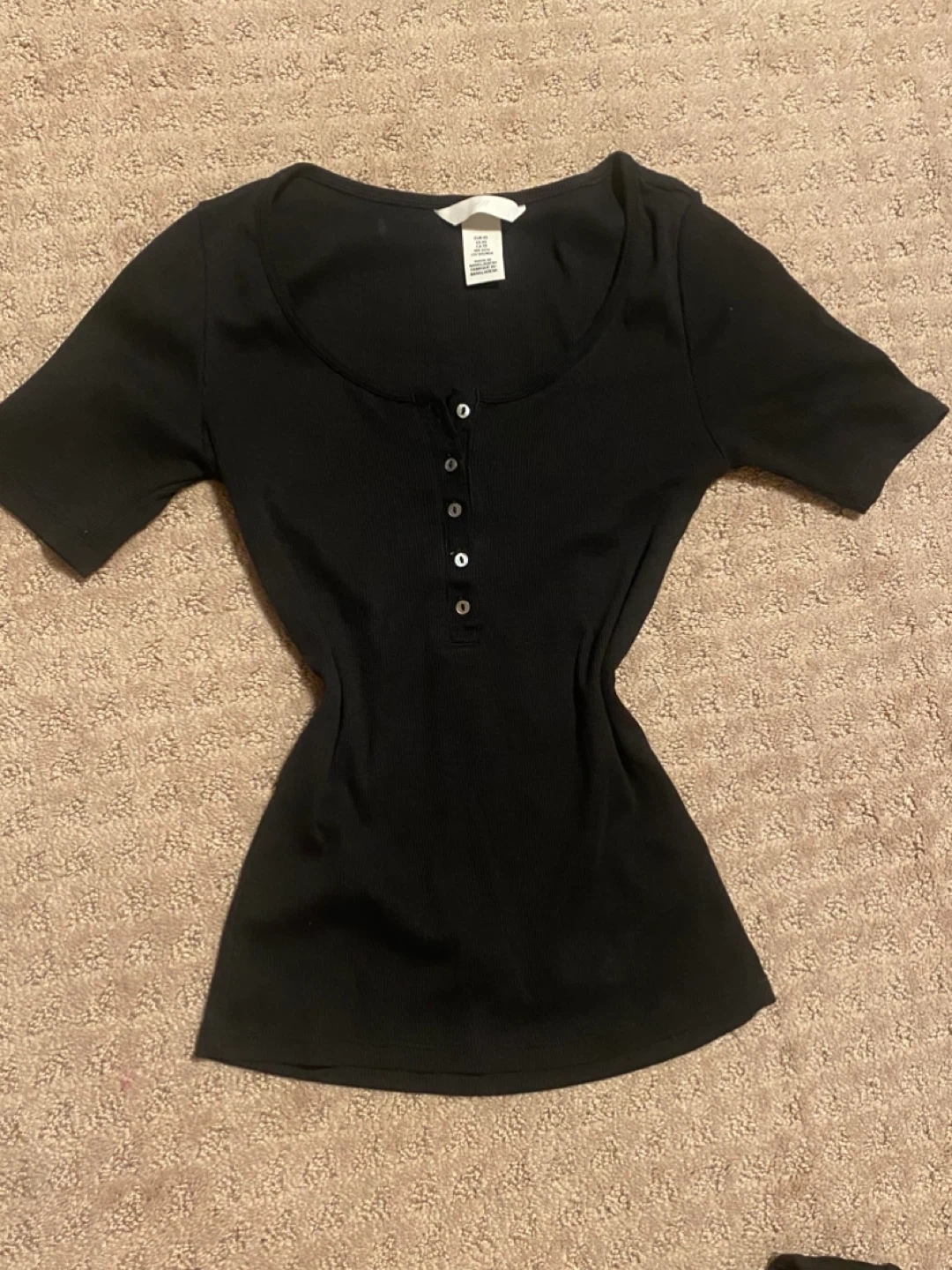 I'm selling a cute black ribbed top from H&M! It's a size XS and in great condition. Perfect for layering or wearing on its own. It has a scoop neck and button-up detail. The material is soft and comfortable, making it a versatile addition to your wardrobe