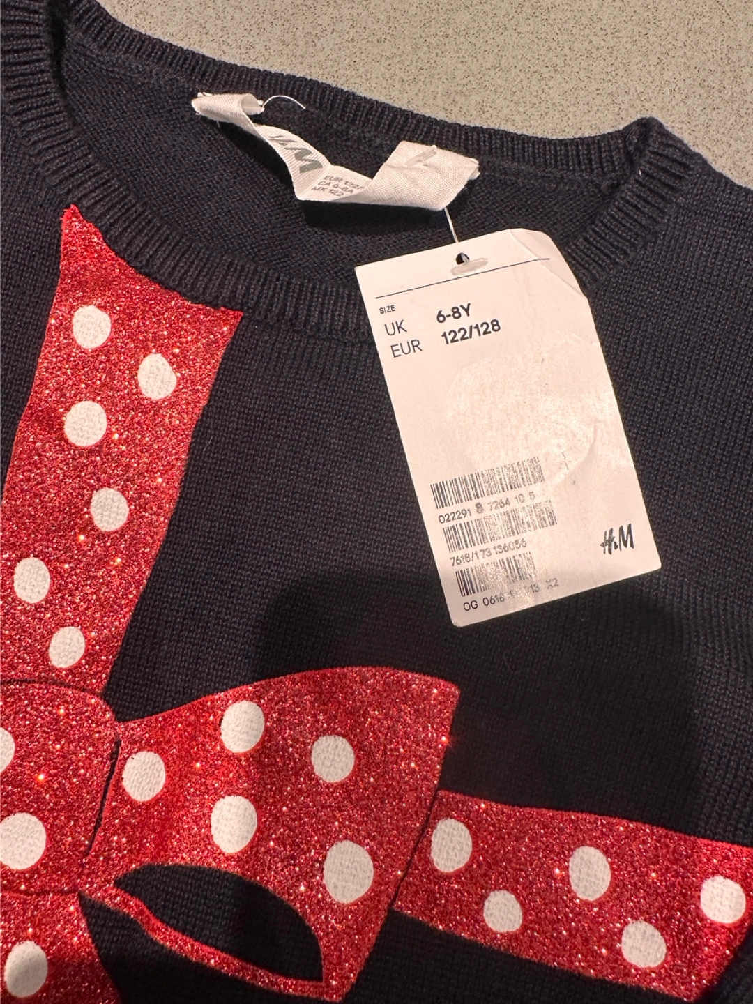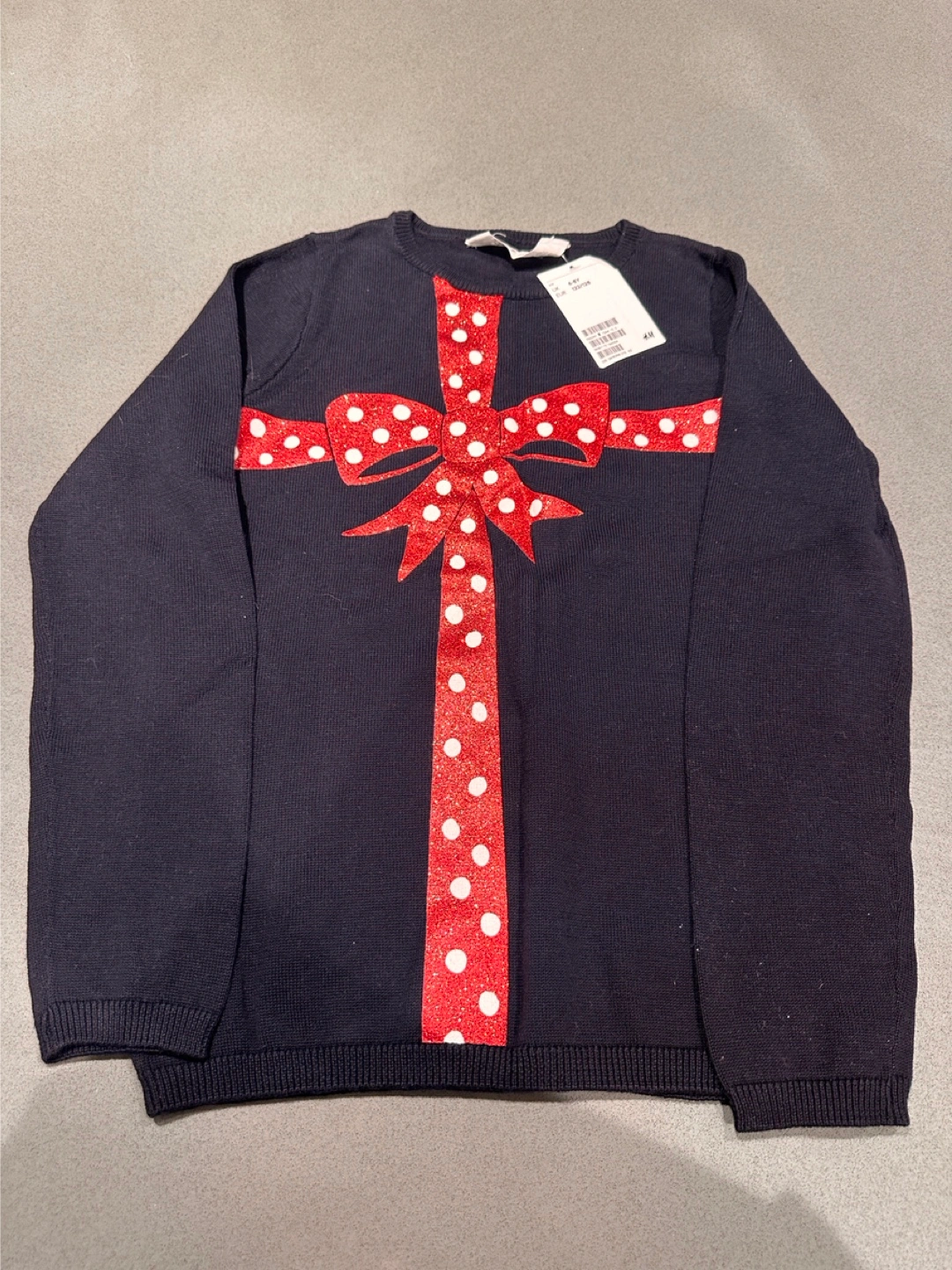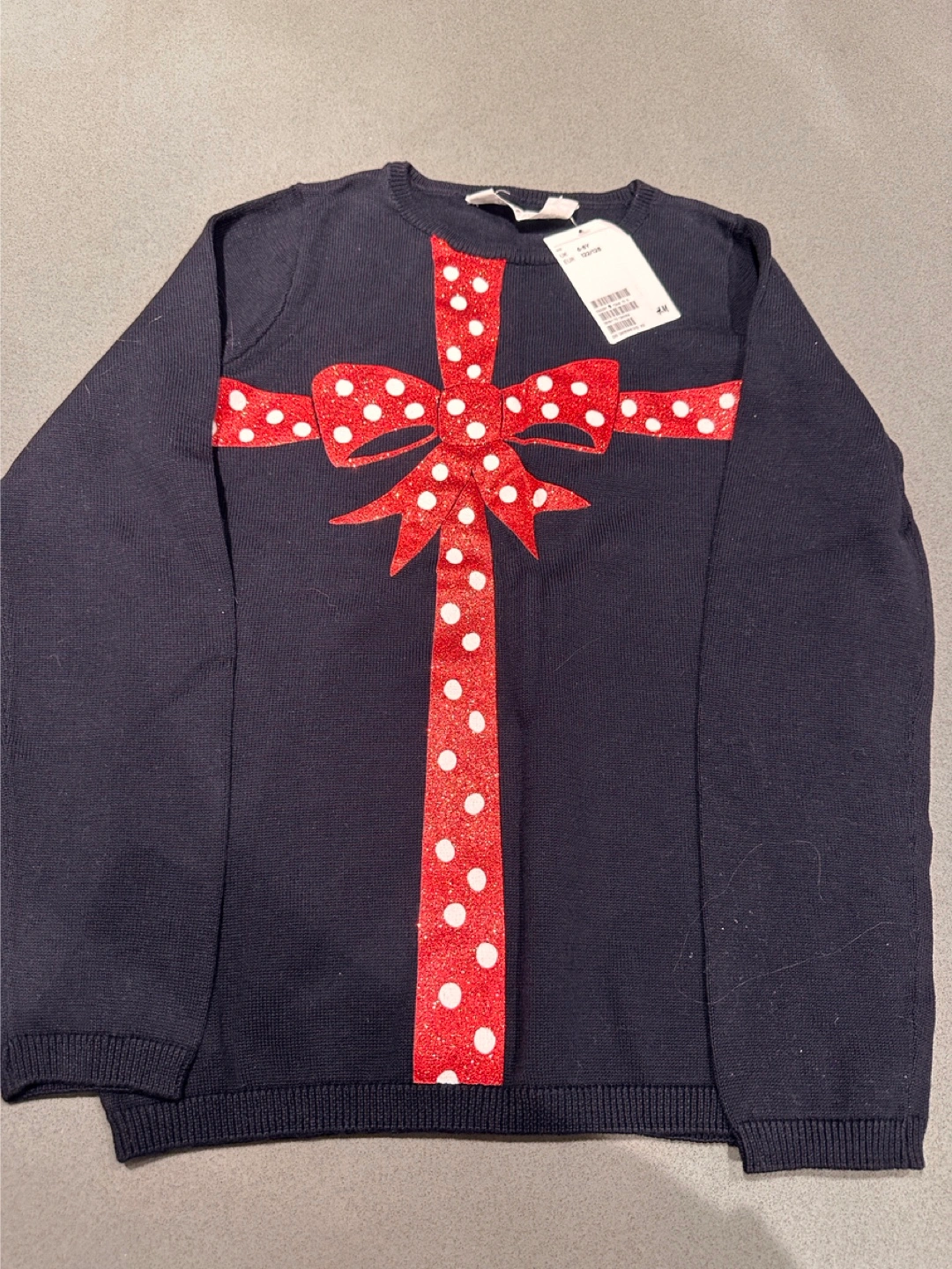 Selling a cute H&M sweater in black with a sparkly red bow design! It's in great for the holidays. The size is 6-8 years (122/128).