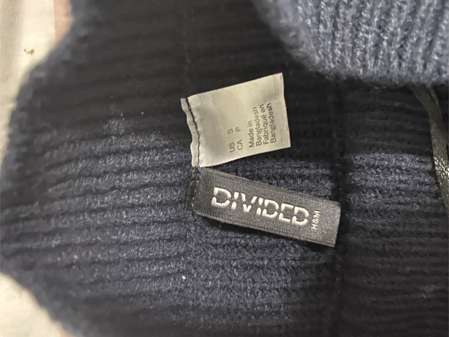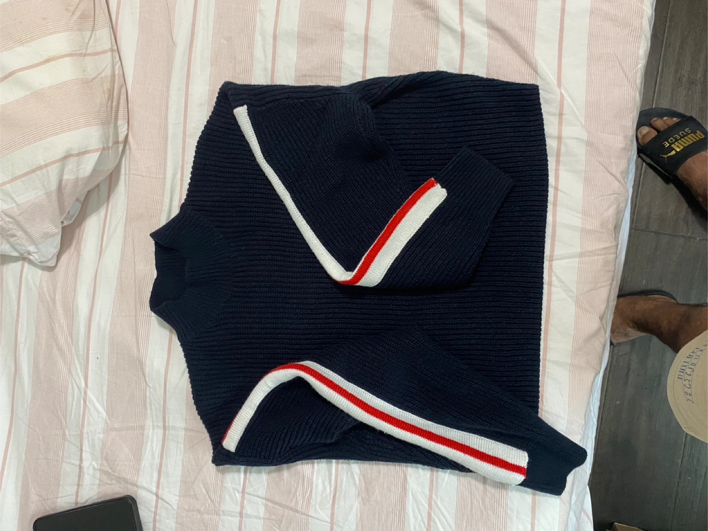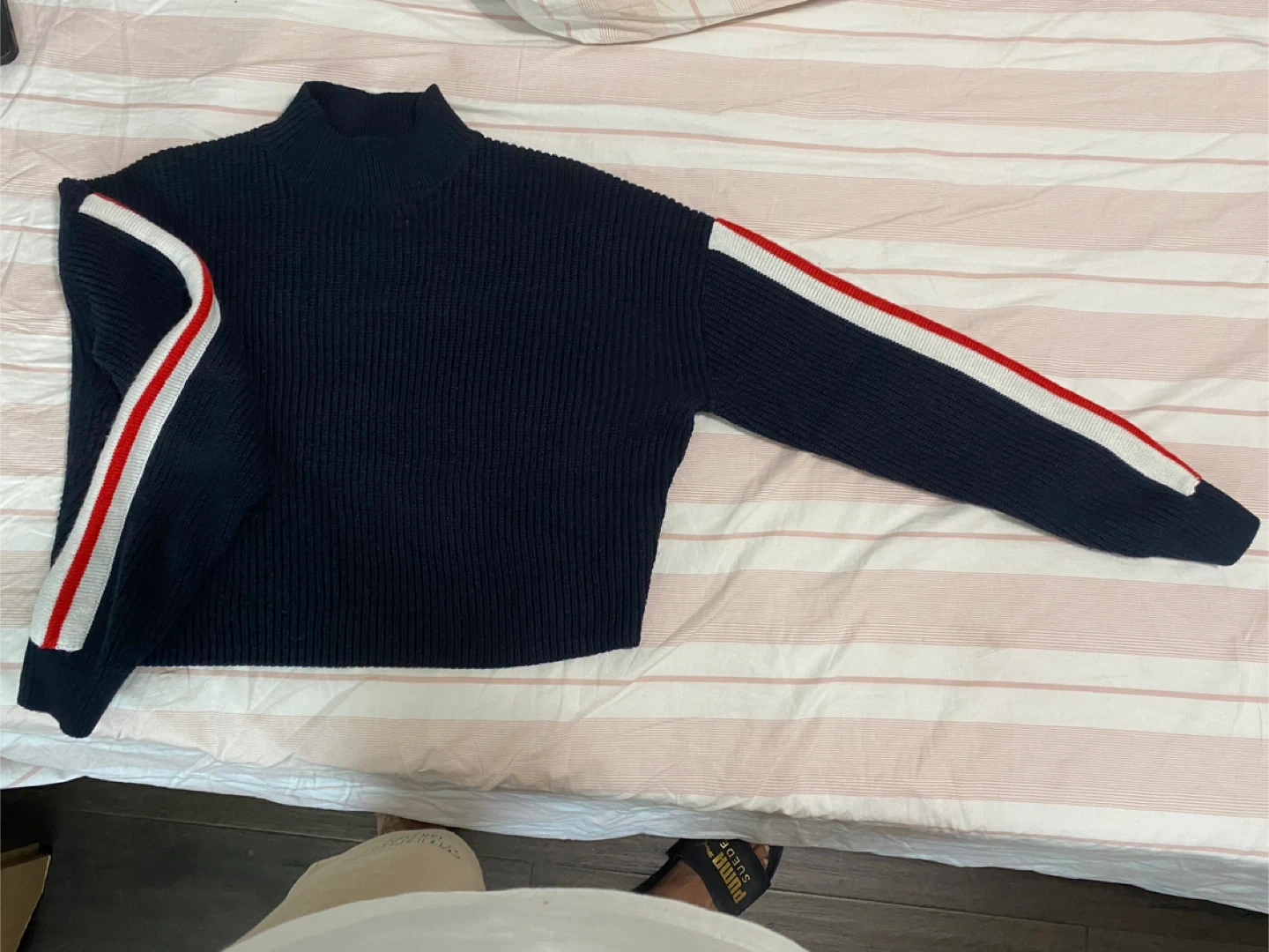 Selling a comfy H&M Divided sweater! It's a navy colour with red and white stripes on the sleeves. Size is small and it's in great condition!