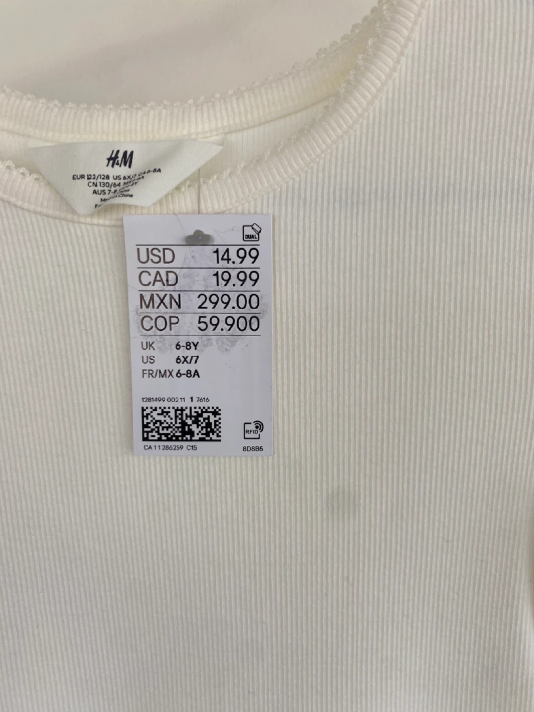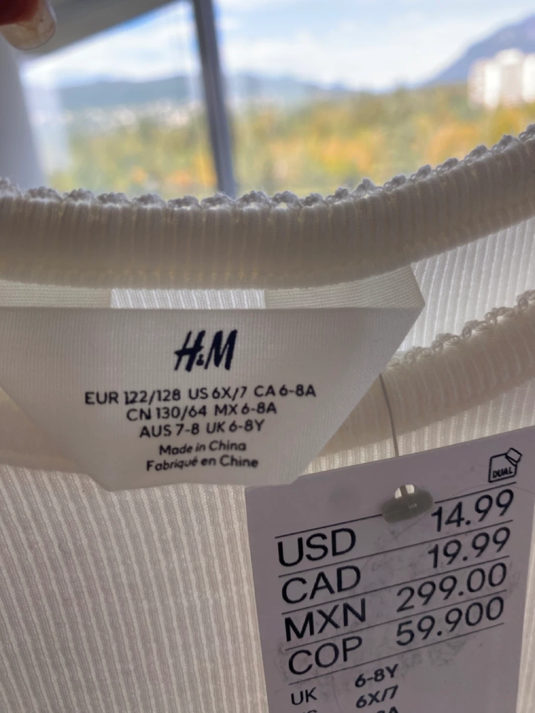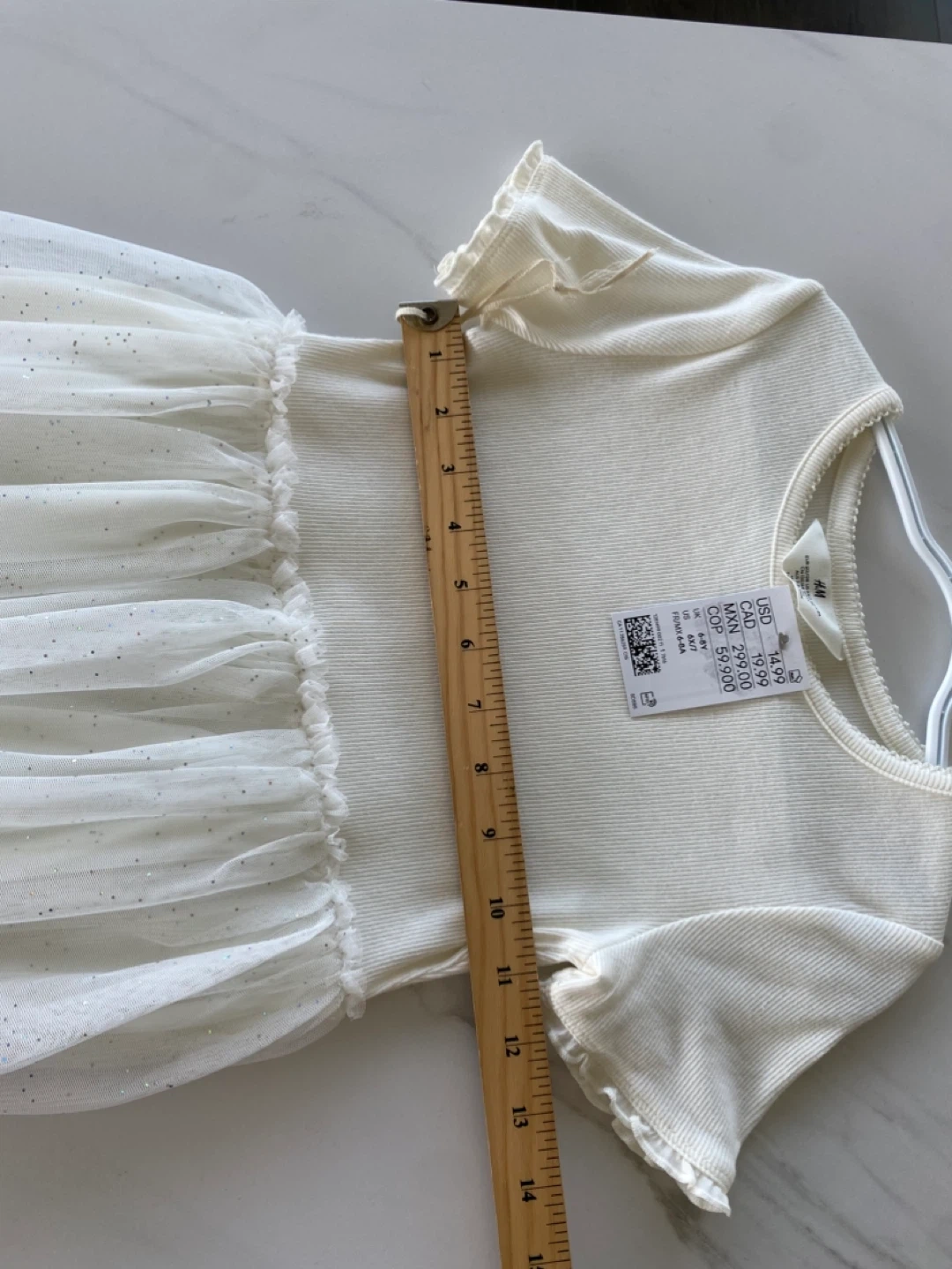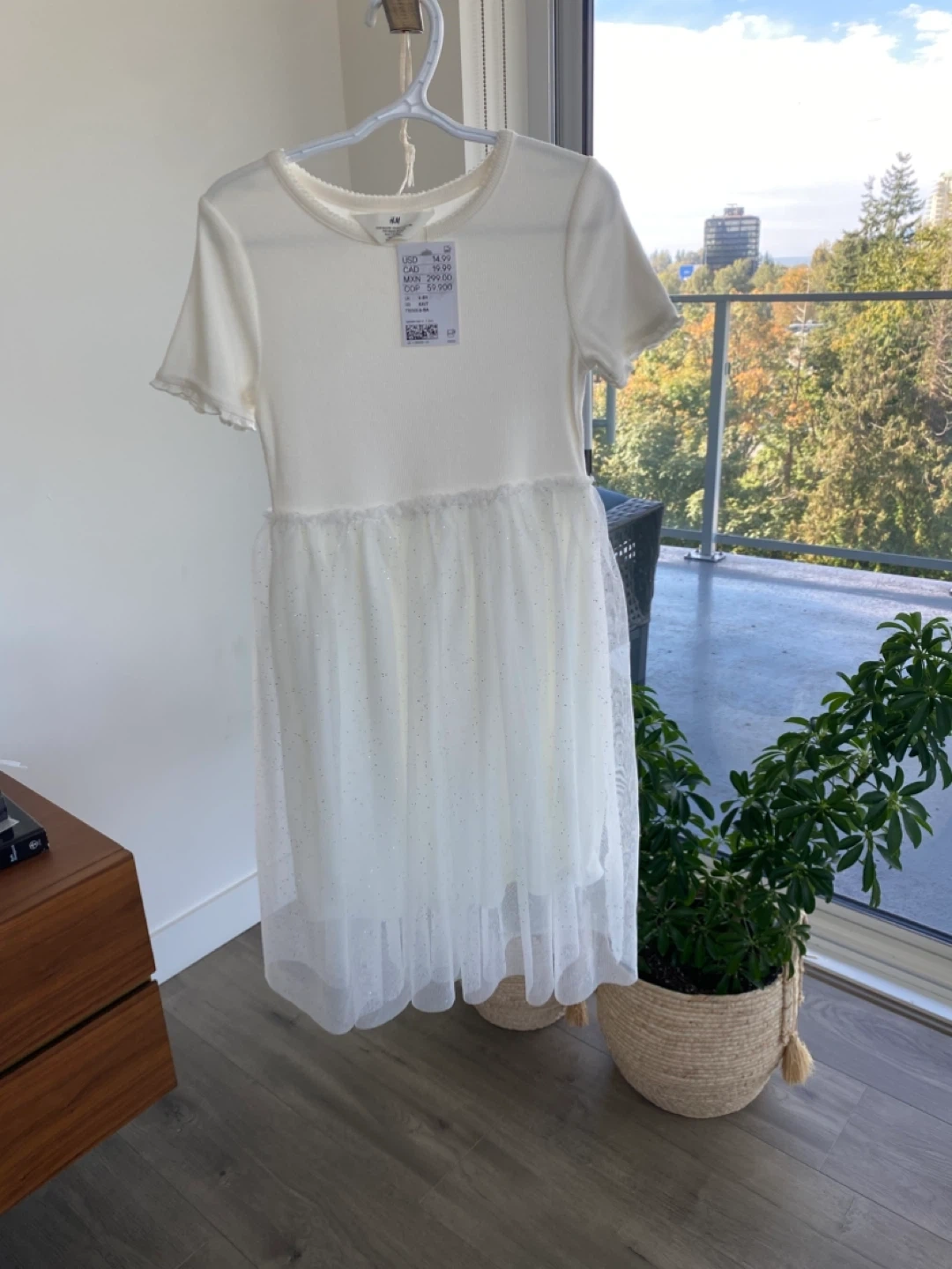 A cute white dress from H&M, perfect for your little one! It's a size 6X/7, and the tag shows it originally retailed for $19.99 CAD. It looks to be in great condition and ready for a new home