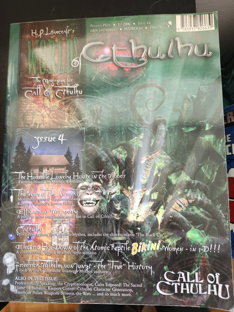 Selling a copy of H.P. Lovecraft's World of Cthulhu magazine, issue #4. It features articles such as 'The Horrible Lonely House in the Woods', 'Voice of the Animals', and 'Electric Hue-Down of the Atomic Reptile Bikini Women - in 3-D!!!'
