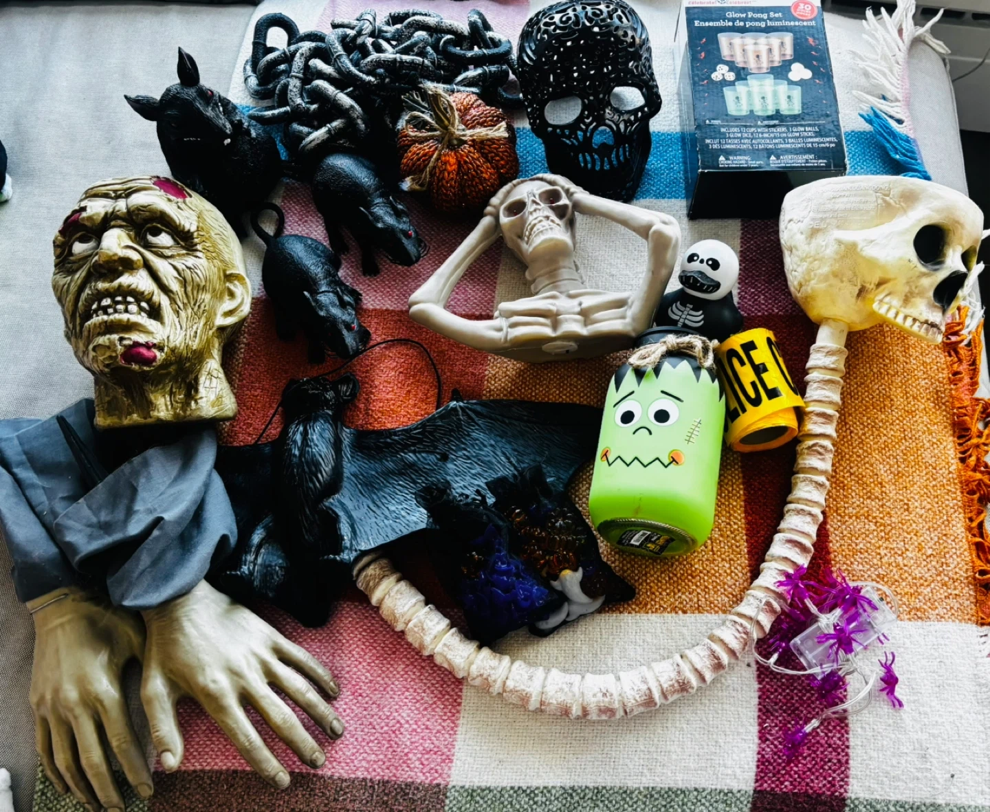 includes: halloween edition beer pong game skeleton funnel opened roll of caution tape light up skeleton frankenstein jar spider lights three plastic scary rats a hanging bat hallowed black skull plastic chains pumpkin scary arms and head skeleton rubber duck little ghost/pumpkin/bat figurines