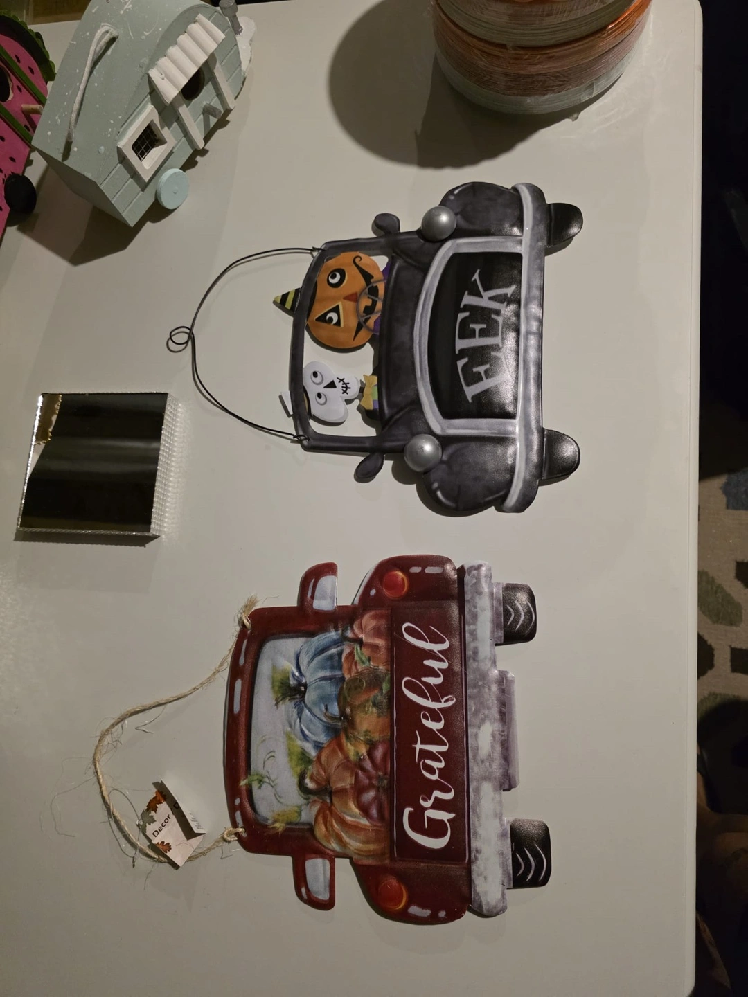 cute set of Halloween and Fall themed truck decorations! One says "EEK" and features Halloween characters, while the other says "Grateful" with a harvest theme. They're perfect for adding a festive touch to your home $5 for both Pickup in Alcona