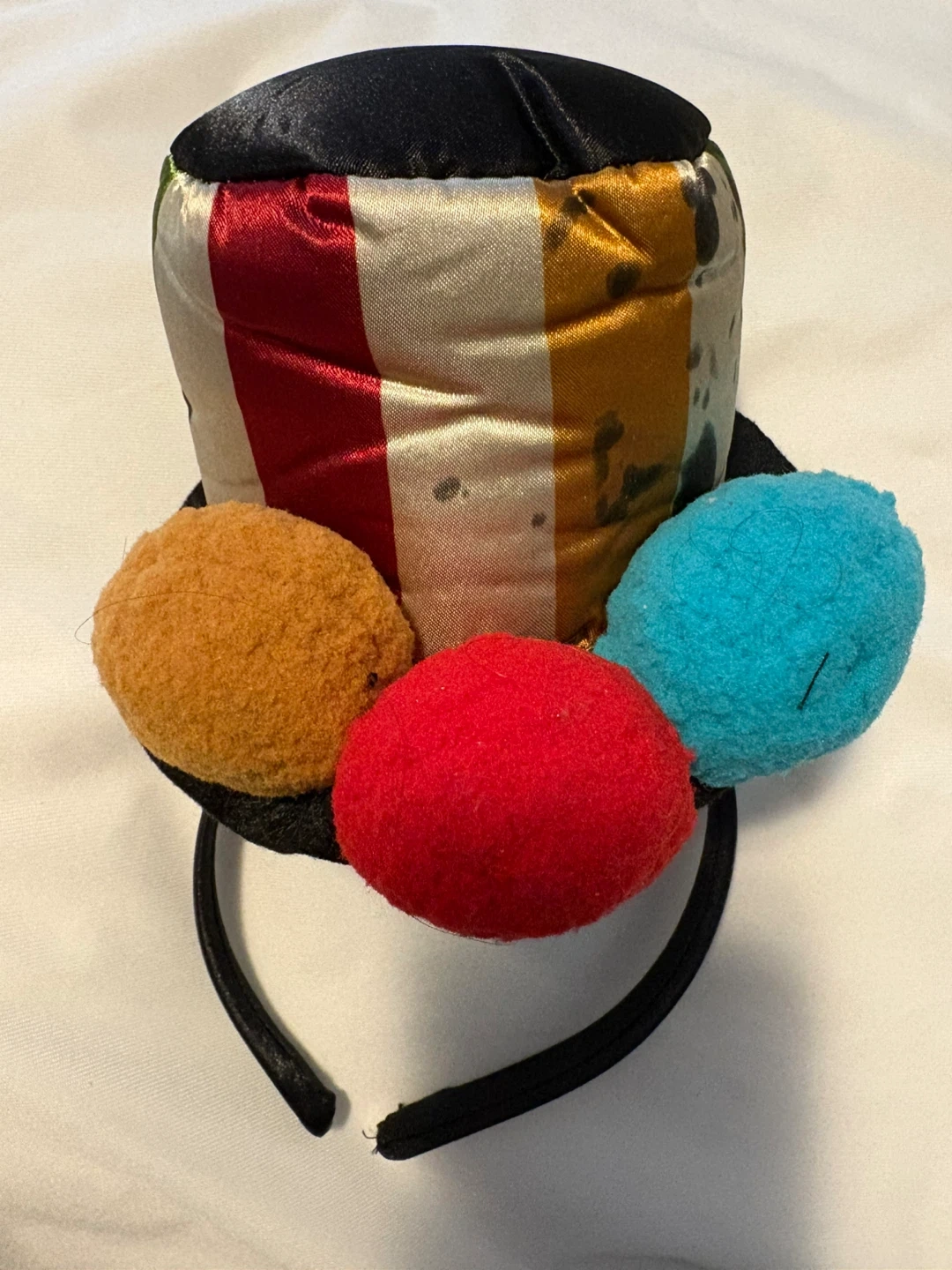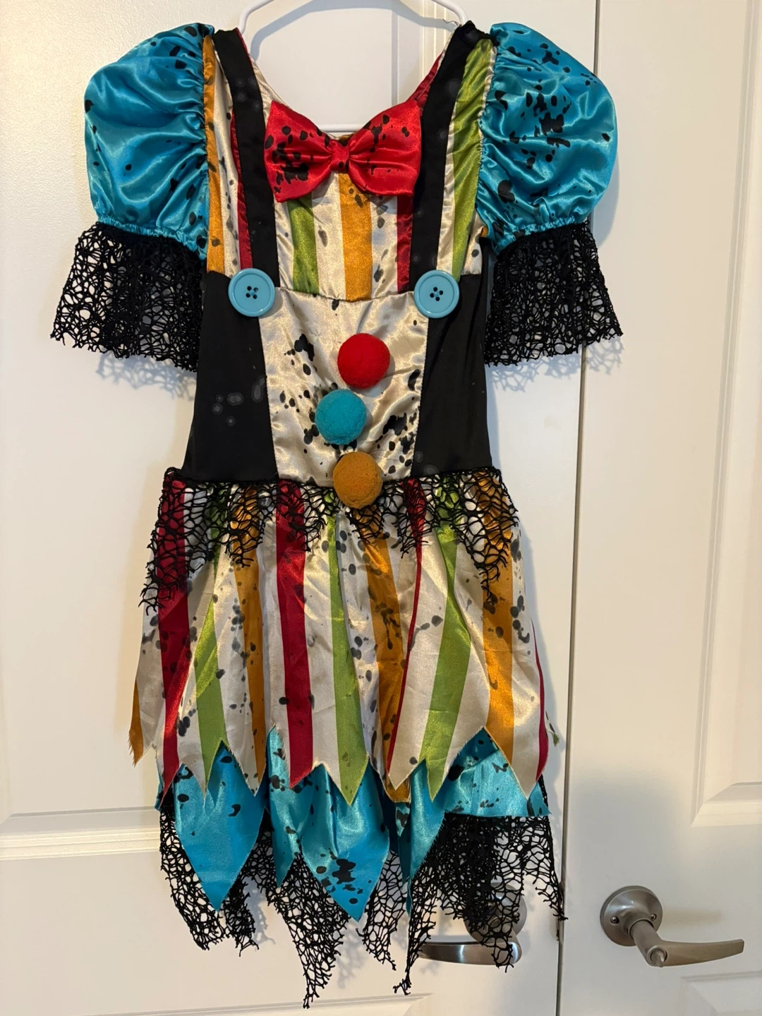 Fun clown costume, perfect for Halloween or dress-up! Includes a colourful dress with lace trim and a matching headband with pom poms. Great for kids who love to play pretend