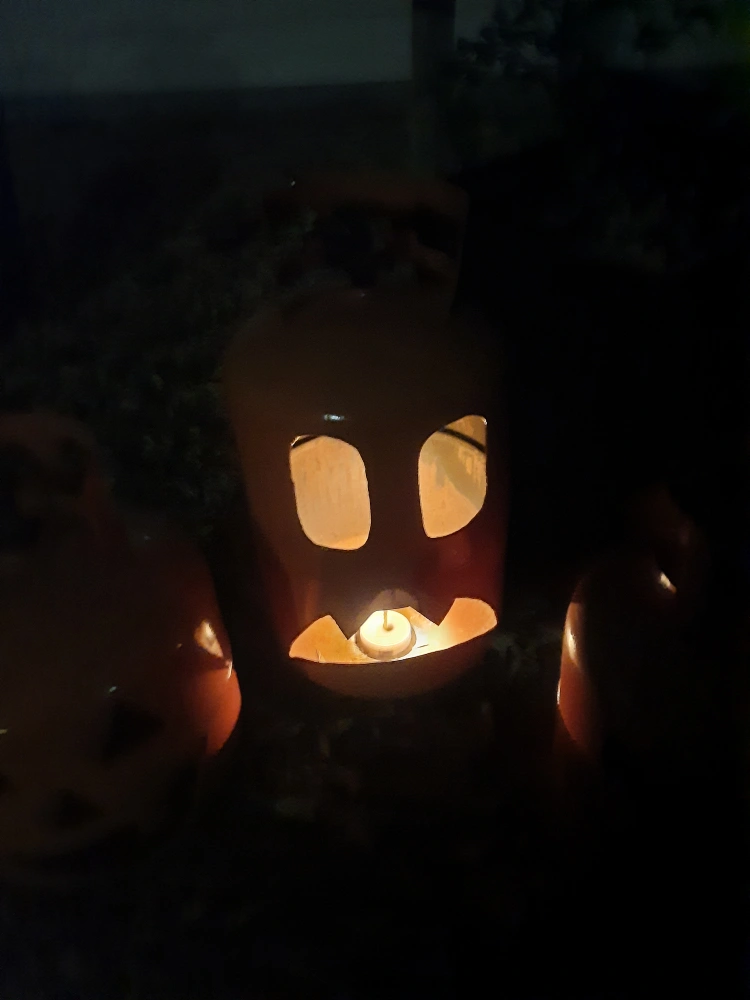 Selling some spooky jack-o'-lanterns for Halloween! They're hand-carved and ready to add some festive flair to your porch or window made from propane tanks they are orange with a green valve to look like a stem $90 for all three or 30 each