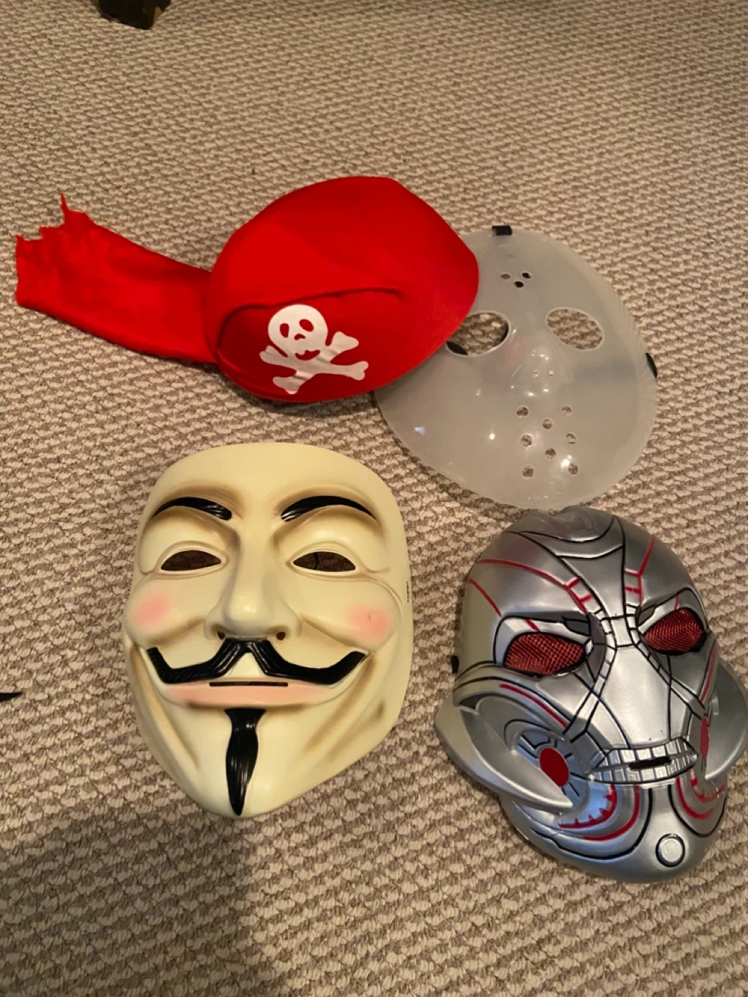 Selling a variety of costume masks! Includes a pirate hat with skull and crossbones, a Friday the 13th hockey mask, a V for Vendetta mask, and an Ultron mask. Great for Halloween!