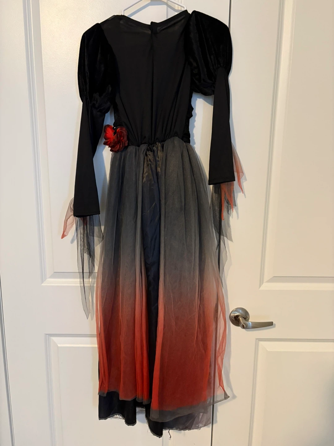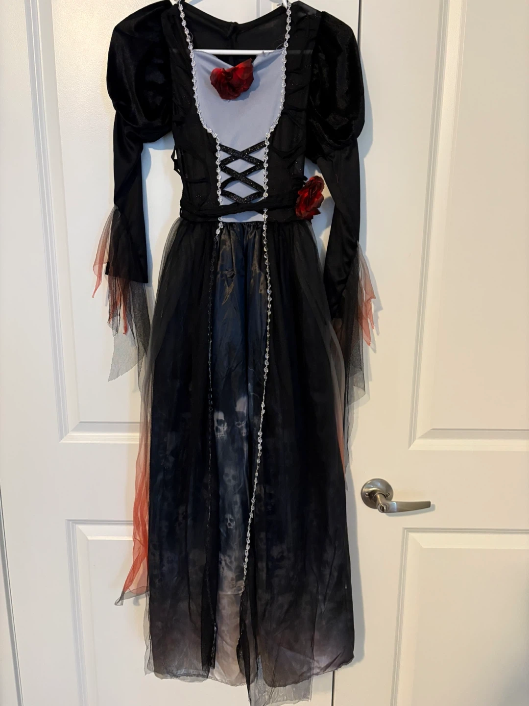 A beautiful vampire costume, perfect for Halloween or dress-up! It includes a dress with velvet sleeves and a layered skirt, along with a matching headband adorned with red roses. The costume is in great condition and ready for a new home!