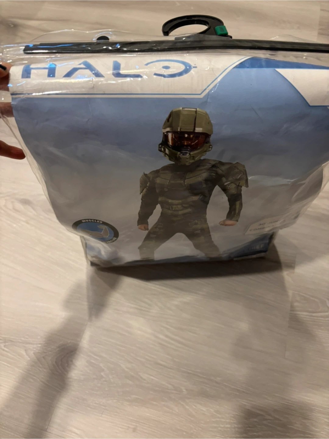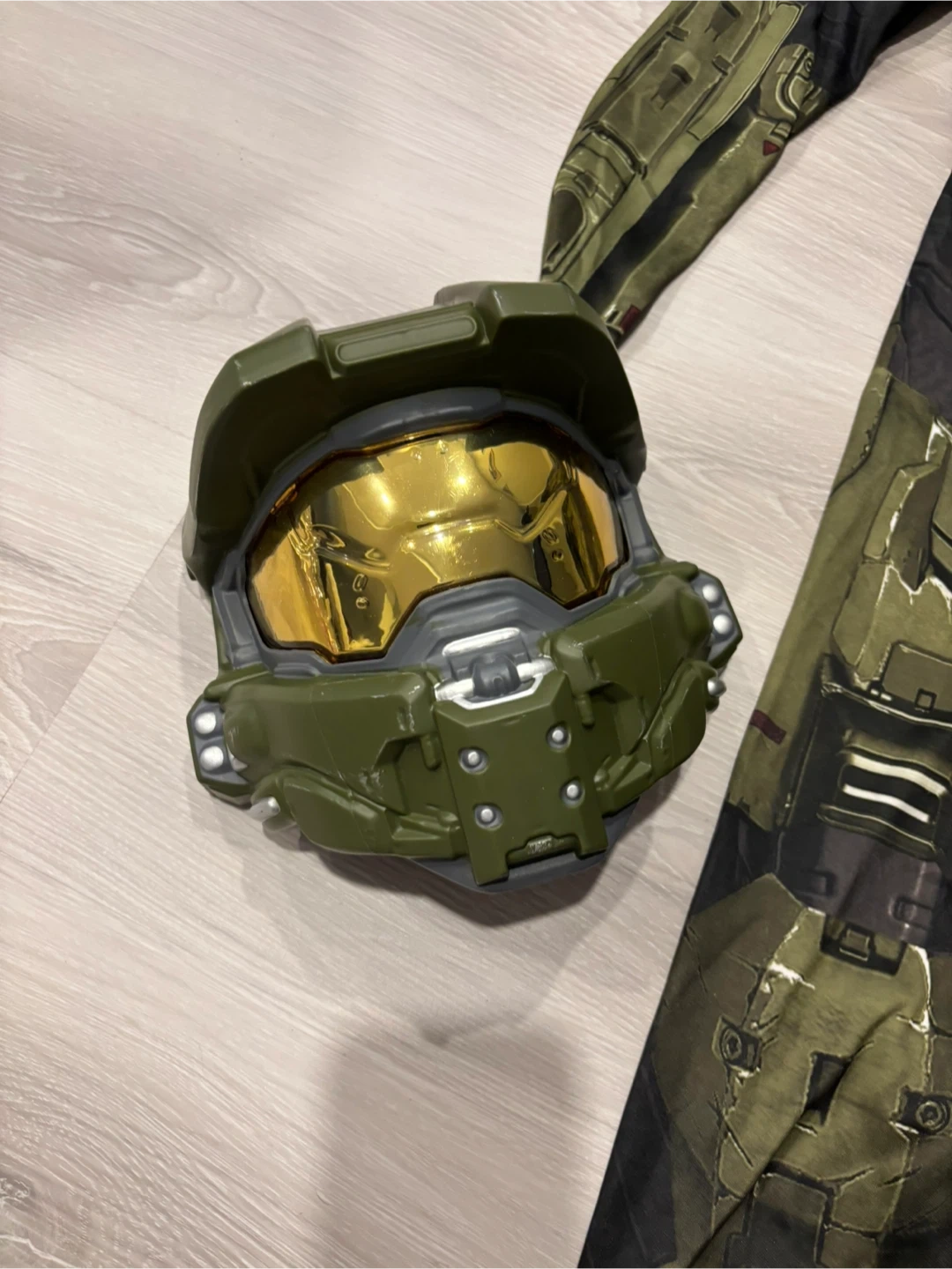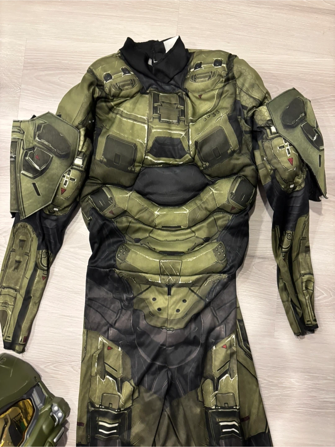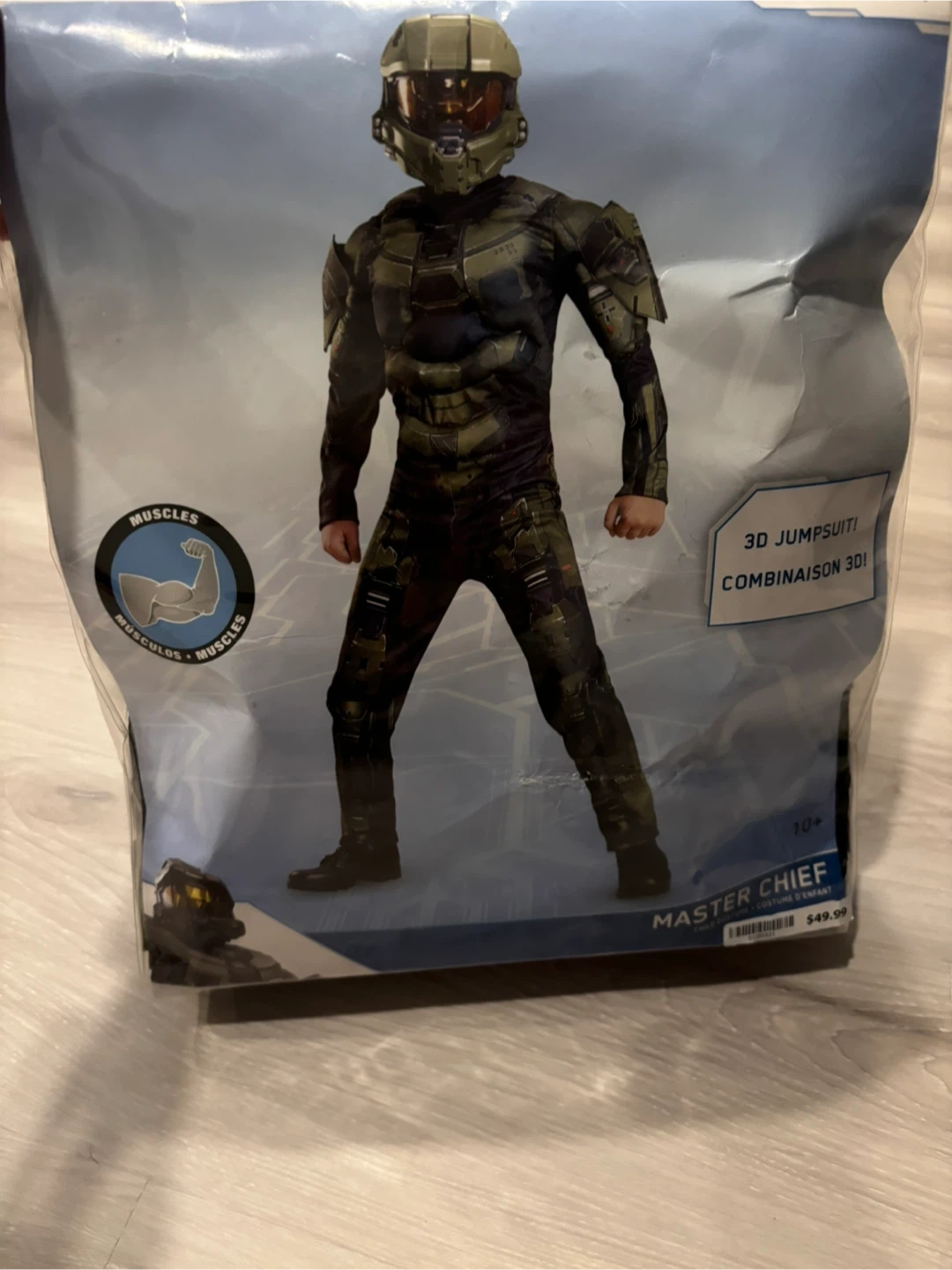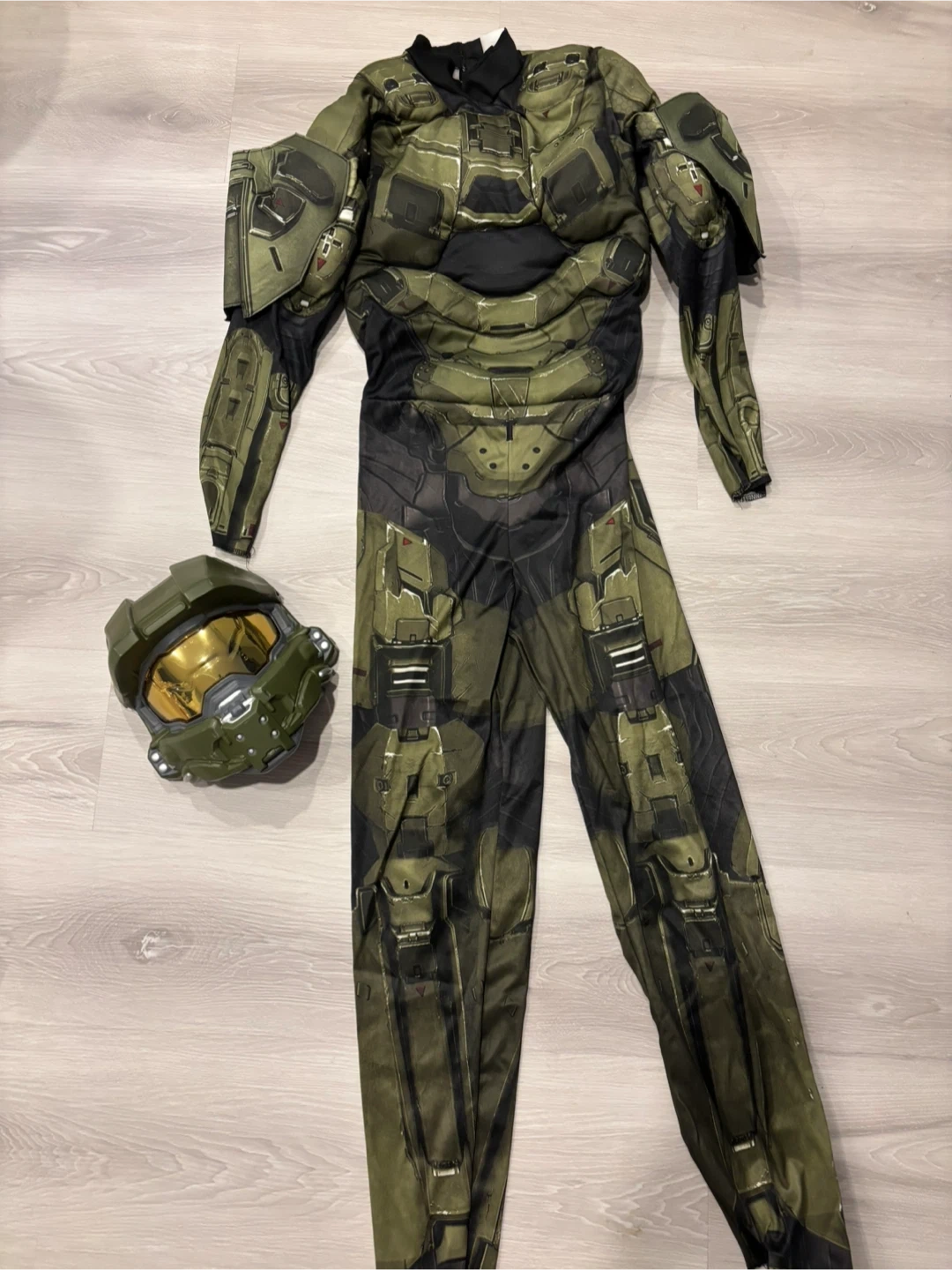 Pick up only Yonge & Steeles Selling a Halo Master Chief costume for kids. It's a size L (10-12), suitable for children around that age range. This 3D jumpsuit costume is in great shape and ready for Halloween or dress-up fun!