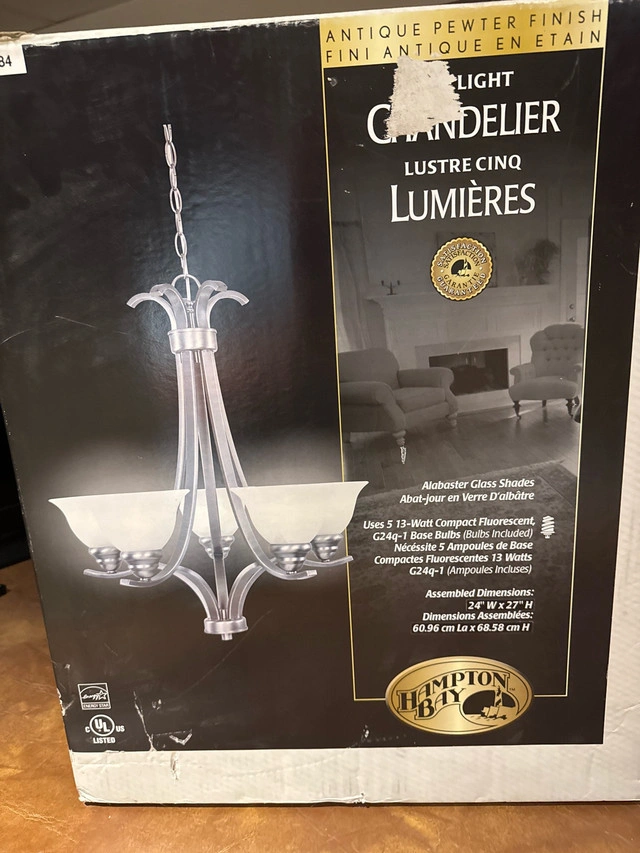 Brighten your home with this new Hampton Bay chandelier, featuring an antique pewter finish and alabaster glass shades, designed to use five 13-watt compact fluorescent bulbs, which are conveniently included. Key Features: * Finish: Antique Pewter * Shades: Alabaster Glass * Bulb Type: Uses 5 13-Watt Compact Fluorescent G24q-1 Base Bulbs (Bulbs Included) * Dimensions: 24 inches (W) x 27 inches (H) / 60.96 cm x 68.58 cm Transform your dining room or living space with this elegant lighting fixture! I'm pricing this one competitively, so it's ready to light up your home! If the ad is up, it's still available!