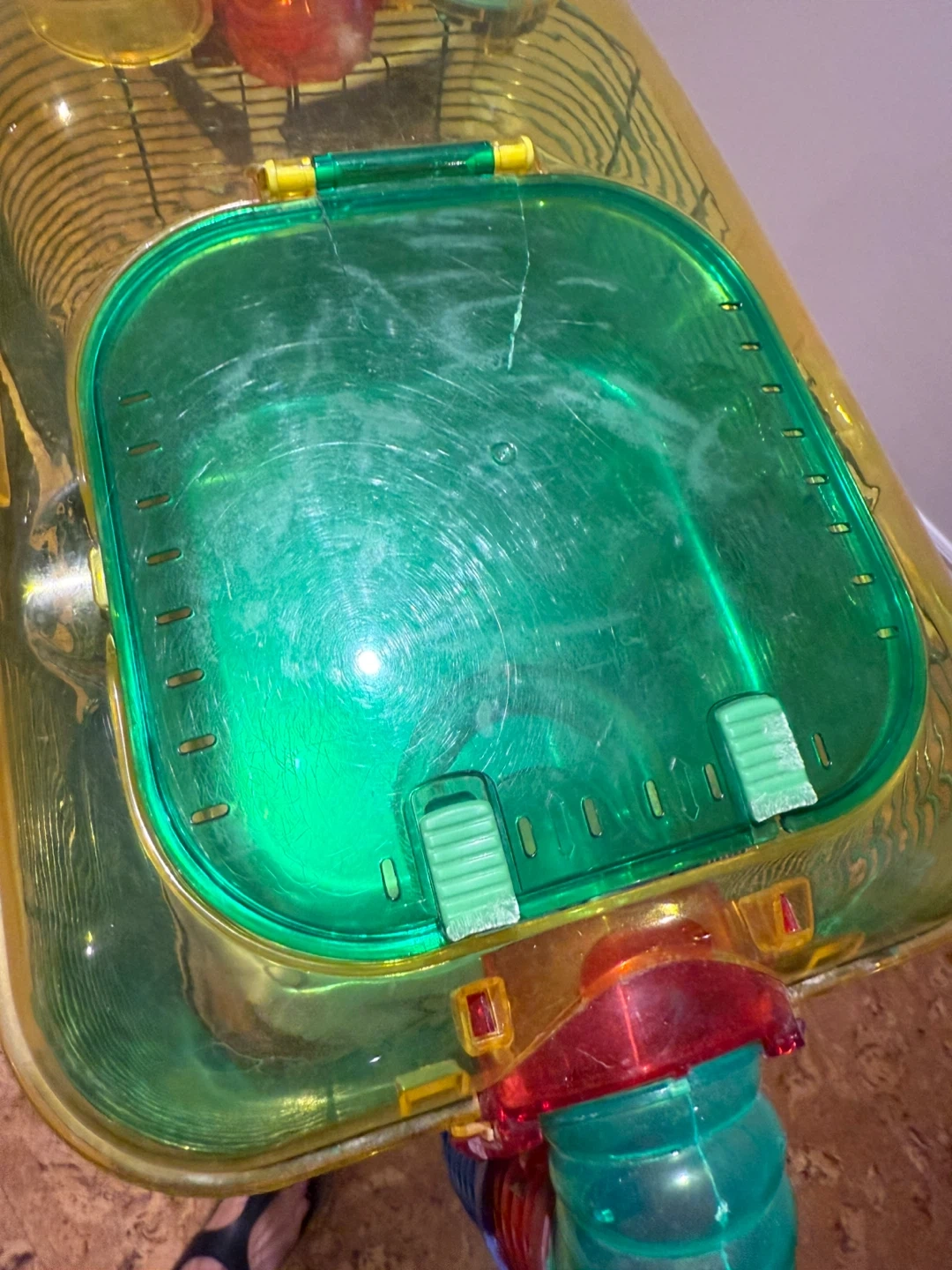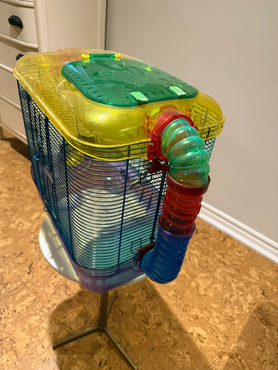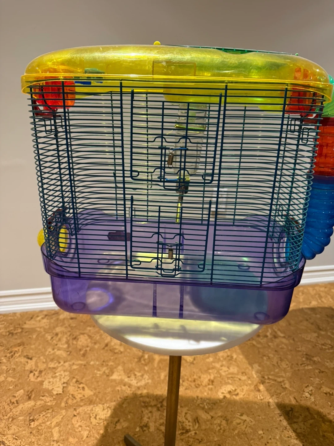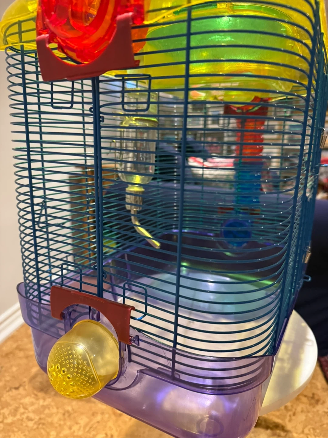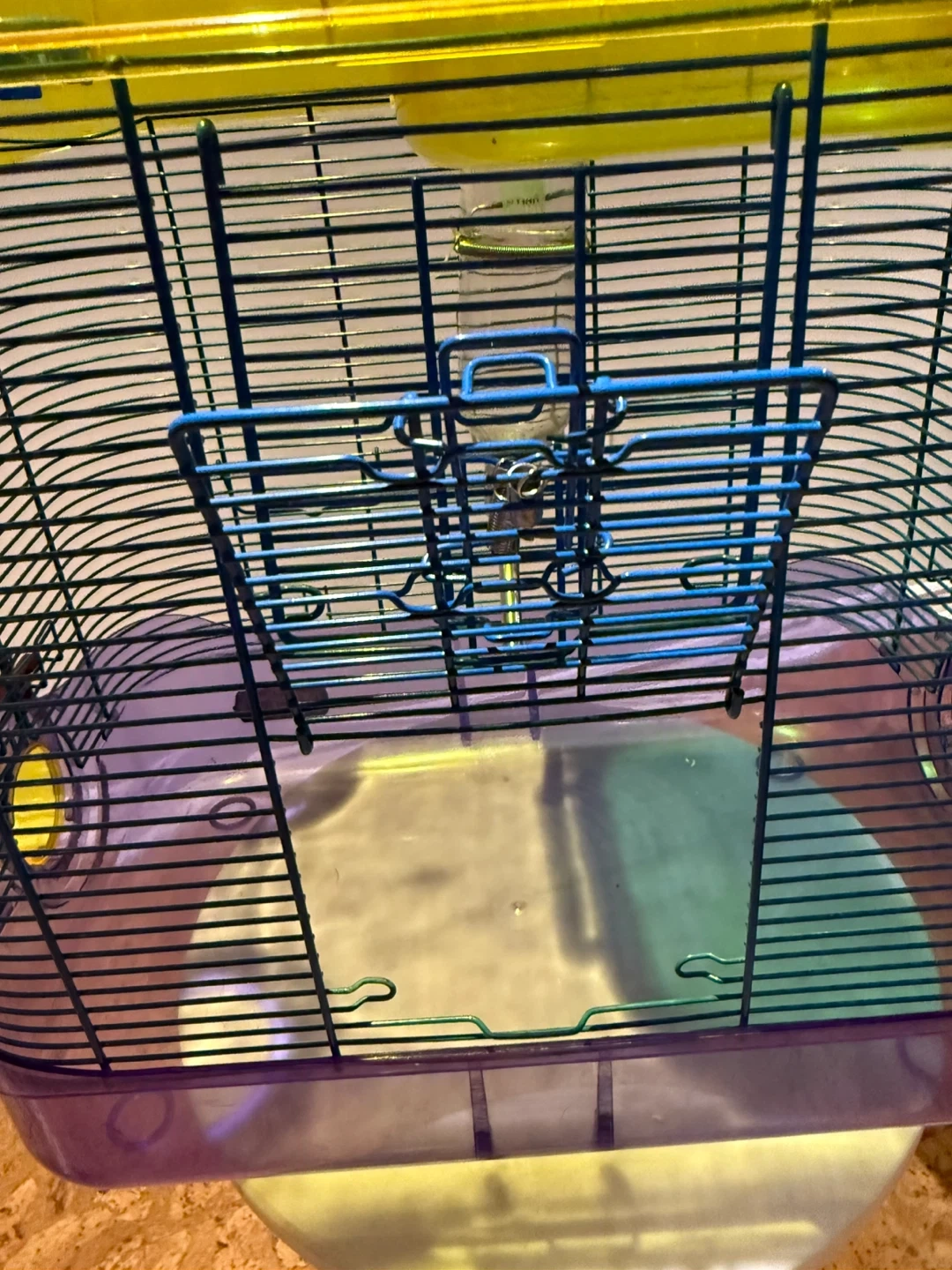 Selling a wire and plastic rodent (hamster/gerbil) cage that's in great shape! It comes with a glass water bottle and fun tubes for your little friend to explore. The cage is a colourful mix of blue, yellow, and purple, making it a cheerful home for your hamster. Throwing in a plastic free run ball and some critter powder.