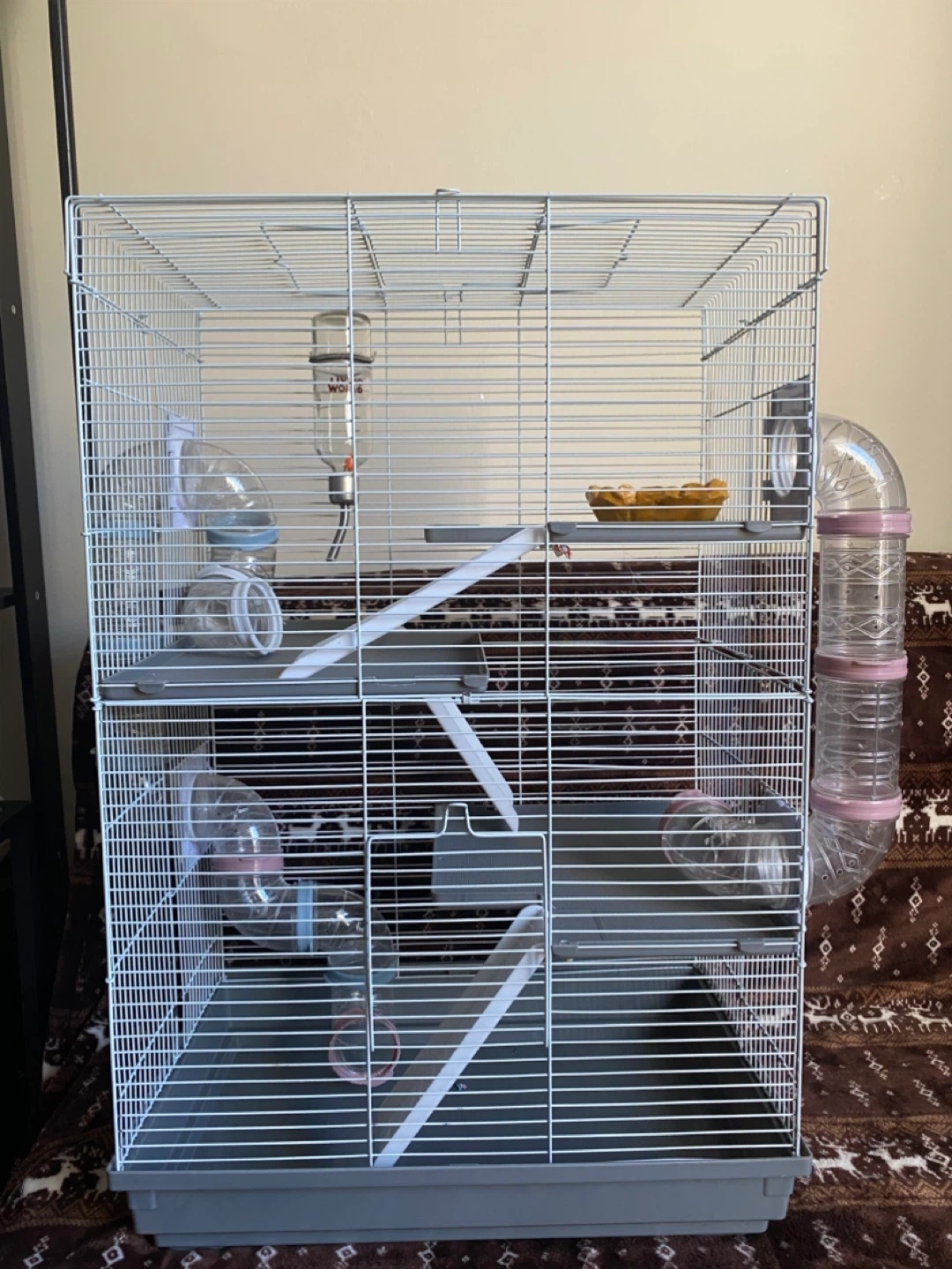 Selling a big hamster or gerbil cage with accessories. Includes food, bedding, sand for litter, toys, and a wheel. The cage is multi-tiered and comes with tubes for climbing and exploring. Just add a hamster 🐹🤍 I sell it in bulk no individual items sale.