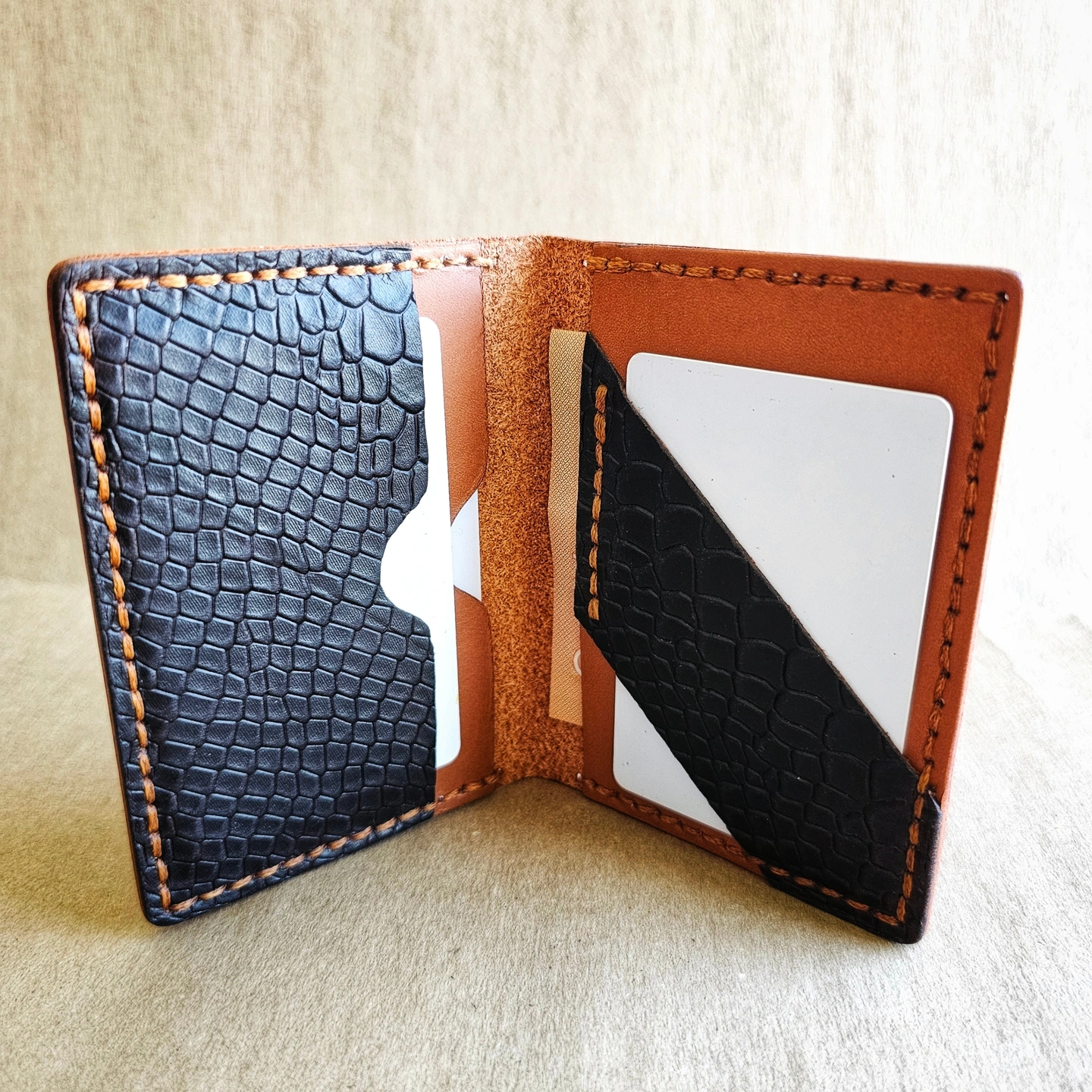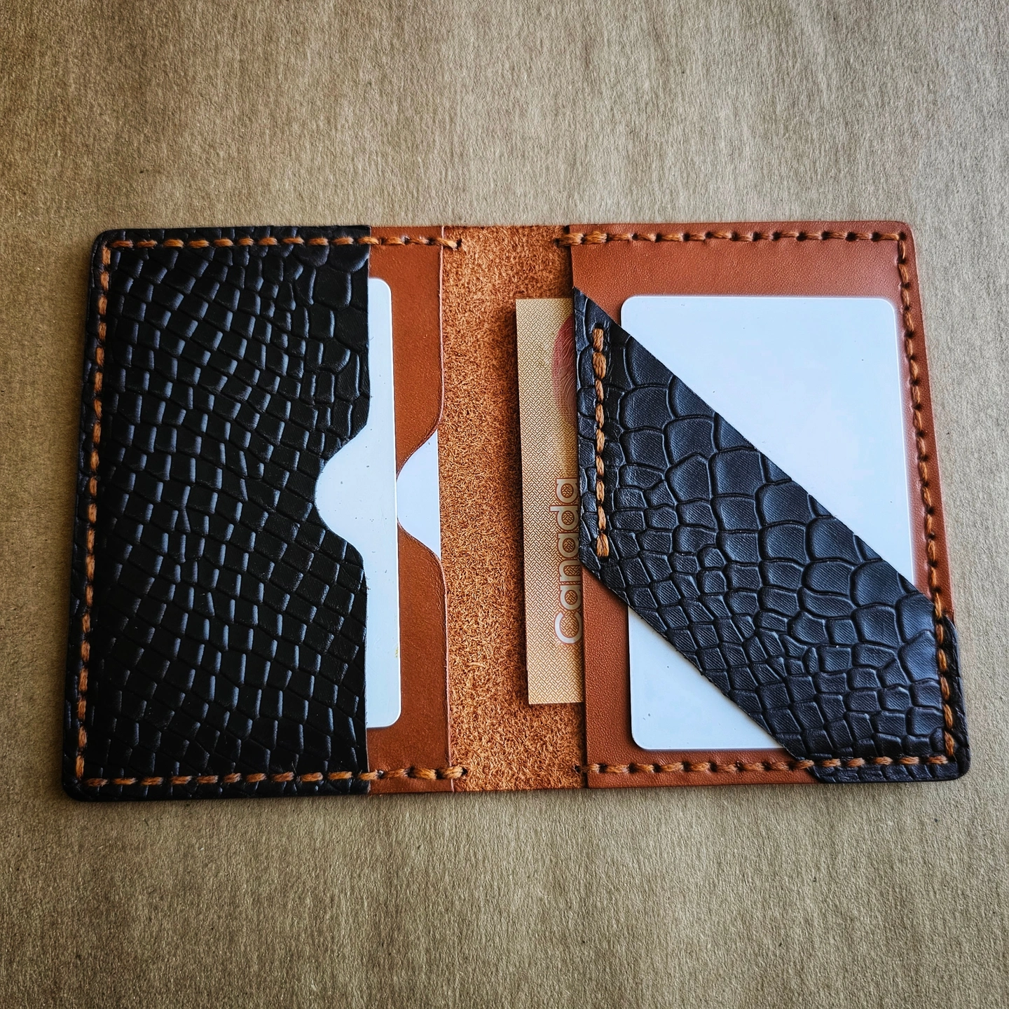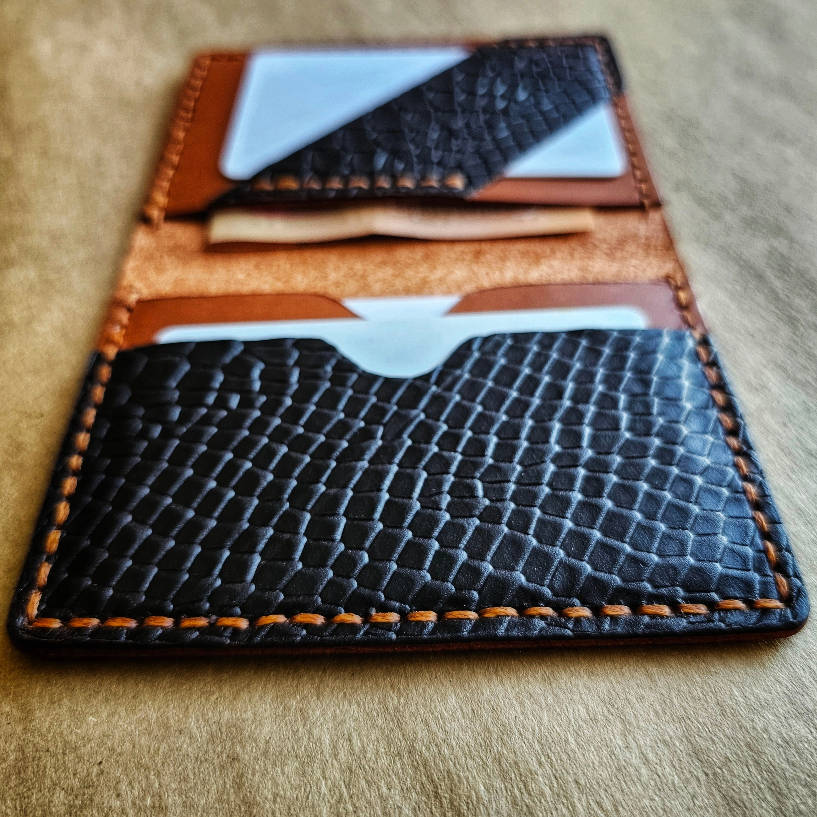 Handmade in our small workshop, this bifold leather wallet is crafted from vegetable-tanned cowhide with python-embossed accents. Lightweight yet durable, it comfortably fits up to 10 cards and cash. **Please note that each item is handmade to order and entirely unique. Due to the natural characteristics of the leather, the final product you receive may differ slightly from the pictures shown.** * Each piece is hand-cut, hand-crafted, and hand-stitched in Canada with care by our small workshop. * Compact and minimalist design with 4 card slots for organization. Dimensions: approximately 11cm by 8cm. * Thoughtful Gift: An excellent choice for gifting during the holiday season, birthday, or any other occasion.